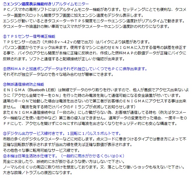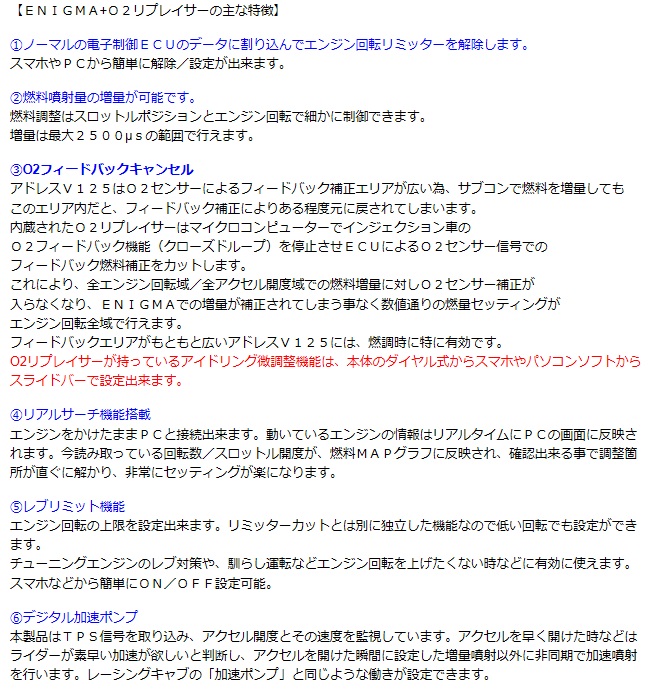 Enigma type Premium Ready to Fitです。アドレスV125のECUに完全カプラーONでワンタッチ取り付け可能なモデルです。配線接続のミスが無く、作業は説明書が要らない位とても簡単で、ECUをカプラーに「カチッ」と繋ぐだけです。O2リプレイサーをEnigmaに内臓している一体型で、コンパクトです。配線接続作業がない為、取り付け作業時間が大幅に短縮できます。Bluetooth /Bluetooth LE接続モデル アンドロイド/iOS両方に対応しますインジェクションコントロールサブコン「ENIGMA」に「O2リプレイサー」を内蔵したプレミアムバージョンを 取り付けが簡単なカプラーONにしたパーフェクトバージョンです。アンドロイド端末、iOS端末とWindowsPCに接続可能です。MACには接続不可同じ燃調MAPをEnigmaを介してPCとスマホで共用出来ます。DILTS品はデスチャージポンプ制御のアドレスV125(K9/L0/L3)のノーマルECUに割り込み接続する事により、 優れた燃料制御性能を発揮します。今まで出来なかったさまざまなセッティングや変更が出来るようになります。また、O2センサーフィードバックエリアではサブコンで増量しても、O2フィードバック機能により燃調がある程度元に戻されてしまいますが「O2リプレイサー」がフィードバック機能を停止させアイドリングから全ての回転域で確実に増量を実現しパーフェクトな燃調が行えます。全てのコントロールはパソコン画面かスマートフォン(iOS端末またはアンドロイドスマホ)で行えます。専用のENIGMA操作用ソフトウェアー/説明書はディルツ社HPより無料でPCにダウンロード出来ます。スマートフォン用アプリiOS版はApp Storeから、アンドロイド版はGoogle Playよりダウンロード(有料)して下さい。(各説明画面をよく読んでお間違えの無いようお願い致します)注意CDI点火のK5/K6/K7モデルには使用できません。※平成28年度国内排出ガス規制適合車については、調査中です。現在のところ適用外とさせていただきます。