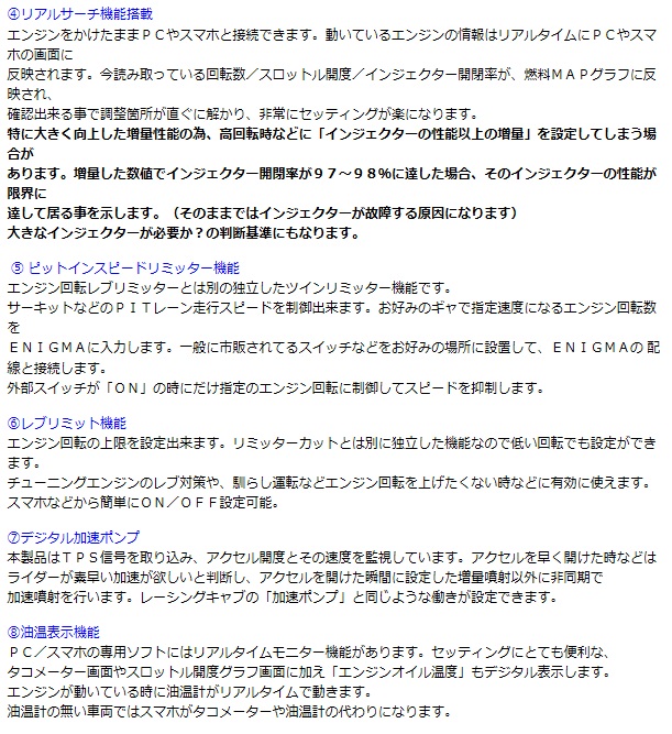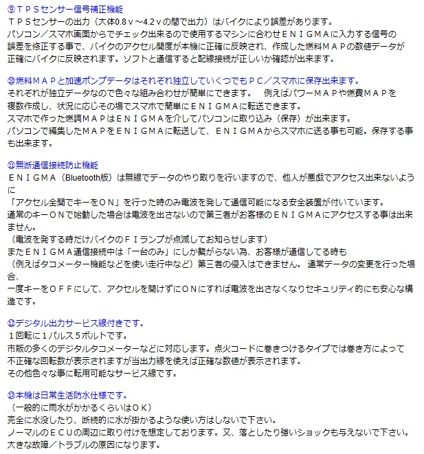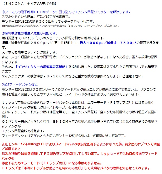 モンキー125(JB02)のノーマルECUに割り込み接続することにより、 優れた燃料制御性能を発揮します。エンジンリミッターの解除や、今まで出来なかったさまざまな燃調セッティングや変更が出来るようになります。また、O2センサーフィードバックエリアでは従来のサブコンで増量/減量しても、O2フィードバック機能により燃調が元に戻されてしまいますが、タイプVでは新たに開発された新型回路により、エラー警告(FIランプ)が点灯する事無く、ECUによるフィードバック燃補正を完全に停止させます。従来品(タイプP)より制御レスポンスが大きく向上しており、任意の増量/減量がイメージ通りに行えます。取り付けはご自分でECU配線にハンダ付け等で割り込み接続するスタンダードタイプです。(ワンタッチカプラーオンのRTFタイプもございます。)取り付け方法(図解)はディルツ社HPより無料ダウンロード出来ます。取り付け後は、全ての操作をスマホやパソコンから無線接続で簡単に出来ます。PC用Enigma type-V専用ソフトウェア(無料)から無線接続で操作ができます。iOS(iPhone)用アプリ又は、アンドロイド用アプリから全ての操作ができます。(スマホ用アプリは有料となります)DILTSダウンロードページのリンク先からソフトやアプリをダウンロードしてください。Bluetooth /Bluetooth LE接続モデル アンドロイド/iOS両方に対応しますアンドロイド端末、iOS端末とWindowsPCに接続可能です。MACには接続不可同じ燃調MAPをEnigmaを介してPCとスマホで共用出来ます。専用のENIGMA type-V操作用PCソフトウェアー/説明書はディルツ社HPより無料でPCにダウンロード出来ます。スマートフォン用アプリiOS版はApp Storeから、アンドロイド版はGoogle Playより基本アプリ(無料)をダウンロードその後、各車種専用の「車種データ(有料)」を選んでダウンロードして下さい。基本アプリ+車種(モンキー125 JB02)データで使用出来る様になります。(詳しくは説明書をご覧下さい)※バイクを複数お持ちの方はスマホの基本アプリ1つに複数の「車種データ」を登録できます。※車種アプリは一度購入されると変更は出来ません各説明画面をよく読んでお間違えの無いようお願い致します※一度購入されたアプリは機種変更後も同じIDで登録されていれば無料で再ダウンロードできます。