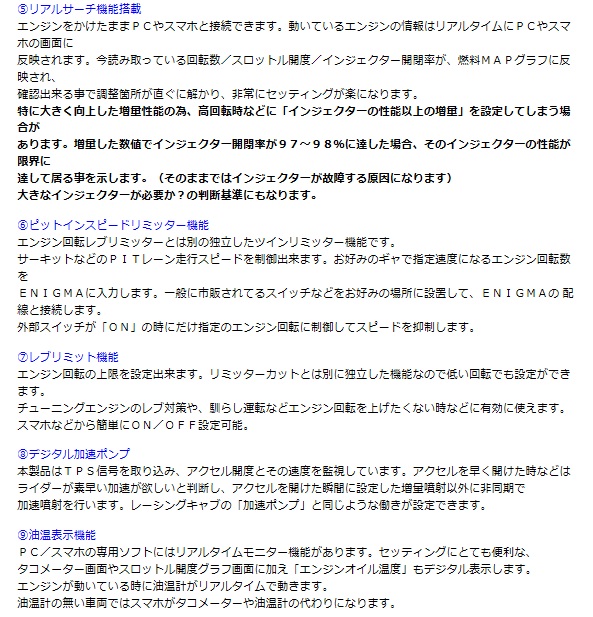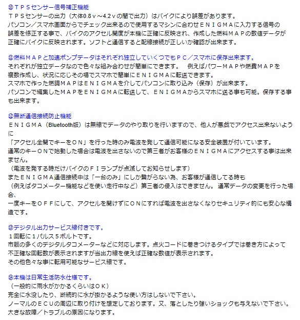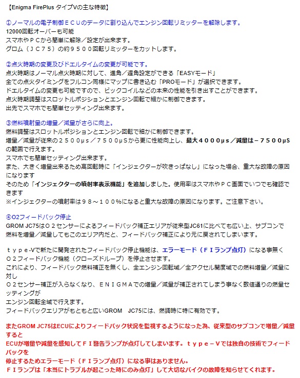 グロム(JC75)のノーマルECUに割り込み配線接続することにより、 優れた点火時期制御および燃料制御性能を発揮します。エンジンリミッターの解除や、今まで出来なかったさまざまな点火/燃調セッティングや変更が出来るようになります。また、O2センサーフィードバックエリアでは従来のサブコンで増量/減量しても、O2フィードバック機能により、燃調が元に戻されてしまいますが、タイプVでは新たに開発された新型回路により、エラー警告(FIランプ)が、点灯する事無、ECUによるフィードバック燃料補正を完全に停止させます。タイプVは従来のファイヤープラスより、制御レスポンスが大きく向上しており、任意の増量/減量がイメージ通りに行えます。取り付けはご自分でECU配線にハンダ付け等で割り込み接続するスタンダードタイプです。(ワンタッチカプラーオンのRTFタイプもございます。)取り付け方法(図解)はディルツ社HPより無料ダウンロード出来ます。取り付け後は、全ての操作をスマホやパソコンから無線接続で簡単に出来ます。PC用Enigma FirePlus type-V専用ソフトウェア(無料)から無線接続で操作ができます。iOS(iPhone)用アプリ又は、アンドロイド用アプリから全ての操作ができます。(スマホ用アプリは有料となります)DILTSダウンロードページのリンク先からソフトやアプリをダウンロードしてください。Bluetooth /Bluetooth LE接続モデル アンドロイド/iOS両方に対応します※最新のスマホ対応情報はこちらアンドロイド端末、iOS端末とWindowsPCに接続可能です。MACには接続不可同じ燃調MAPをEnigmaを介してPCとスマホで共用出来ます。専用のEnigma FirePlus type-V操作用PCソフトウェアー/説明書はディルツ社HPより無料でPCにダウンロード出来ます。スマートフォン用アプリiOS版はApp Storeから、アンドロイド版はGoogle Playより基本アプリ(無料)をダウンロードその後、各車種専用の「車種データ(有料)」を選んでダウンロードして下さい。基本アプリ+車種(GROM JC75)データで使用出来る様になります。(詳しくは説明書をご覧下さい)※バイクを複数お持ちの方はスマホの基本アプリ1つに複数の「車種データ」を登録できます。※車種アプリは一度購入されると変更は出来ません各説明画面をよく読んでお間違えの無いようお願い致します※一度購入されたアプリは機種変更後も同じIDで登録されていれば無料で再ダウンロードできます。注意※2015年、2016年GROM(EBJ-JC61)には対応しません