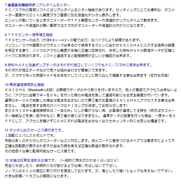 インジェクション&点火コントロールサブコン「ENIGMA FirePlus」Bluetooth /Bluetooth LE接続モデル アンドロイド/iOS両方に対応します。アンドロイド端末、iOS端末とWindowsPCに接続可能です。MACには接続不可同じ燃調MAPをENIGMA FirePlusを介してPCとスマホで共用出来ます。当製品はインジェクション制御バイクのノーマルECUに割り込み接続することにより、 優れた点火時期制御および燃料制御性能を発揮します。今まで出来なかったさまざまな点火/燃料セッティングや変更が出来るようになります。全てのコントロールはパソコン画面かスマートフォン(iOS端末またはアンドロイドスマホ)で行えます。専用のENIGMA FirePlus操作用ソフトウェア/説明書はディルツ社HPより無料でPCにダウンロード出来ます。スマートフォン用アプリiOS版はApp Storeから、アンドロイド版はGoogle Playよりダウンロード(有料)して下さい。(各説明画面をよく読んでお間違えの無いようお願い致します)