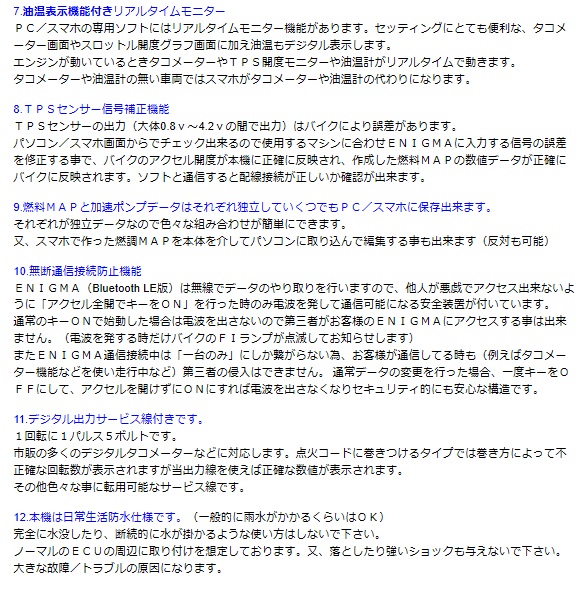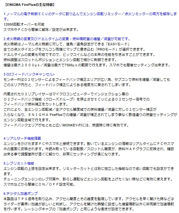 Enigma FirePlus type Ready to Fitです。モンキーFIのECUに完全カプラーONでワンタッチ取り付け可能なインジェクション&点火コントロールサブコンです。ハンダ付作業などが不要の為、配線接続のミスが無く、作業はとても簡単で、ECUをカプラーに繋ぐだけです。 配線接続作業がない為、取り付け作業時間が大幅に短縮できます。Bluetooth /Bluetooth LE接続モデル アンドロイド/iOS両方に対応します。アンドロイド端末、iOS端末とWindowsPCに接続可能です。MACには接続不可同じ燃調MAPをENIGMA FirePlusを介してPCとスマホで共用出来ます。当製品はインジェクション制御バイクのノーマルECUに割り込み接続することにより、 優れた点火時期制御および燃料制御性能を発揮します。今まで出来なかったさまざまな点火/燃料セッティングや変更が出来るようになります。全てのコントロールはパソコン画面かスマートフォン(iOS端末またはアンドロイドスマホ)で行えます。専用のENIGMA FirePlus操作用ソフトウェア/説明書はディルツ社HPより無料でPCにダウンロード出来ます。スマートフォン用アプリiOS版はApp Storeから、アンドロイド版はGoogle Playよりダウンロード(有料)して下さい。(各説明画面をよく読んでお間違えの無いようお願い致します)