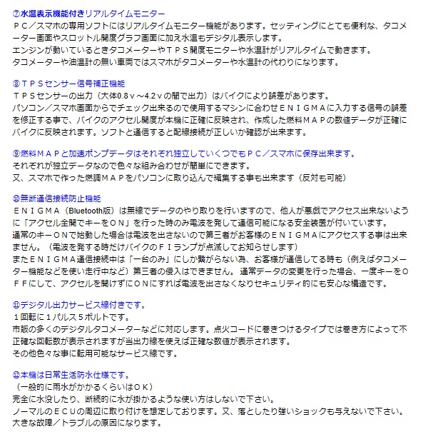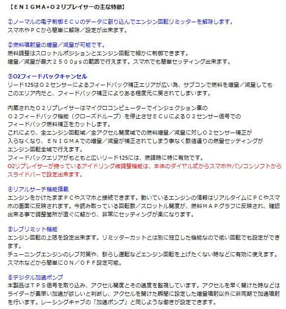 Enigma type Premium Ready to Fitです。リード125(EBJ-JF45)のECUに完全カプラーONでワンタッチ取り付け可能なモデルです。ハンダ付け作業などが不要の為、配線接続のミスが無く、作業はとても簡単で、ECUをカプラーに繋ぐだけです。配線接続作業がない為、取り付け作業時間が大幅に短縮できます。O2リプレイサーをEnigmaに内臓している一体型で、コンパクトです。インジェクションコントロールサブコン「ENIGMA」に「O2リプレイサー」を内蔵したプレミアムバージョンを取り付けが簡単なカプラーONにしたパーフェクトバージョンです。Bluetooth /Bluetooth LE接続モデル アンドロイド/iOS両方に対応します。アンドロイド端末、iOS端末とWindowsPCに接続可能です。MACには接続不可同じ燃調MAPをEnigmaを介してPCとスマホで共用出来ます。当製品はインジェクション制御バイクのノーマルECUに割り込み接続することにより、優れた燃料制御性能を発揮します。今まで出来なかったさまざまなセッティングや変更が出来るようになります。また、O2センサーフィードバックエリアではサブコンで増量/減量しても、O2フィードバック機能により、燃調がある程度元に戻されてしまいますが「O2リプレイサー」がフィードバック機能を停止させアイドリングから全ての回転域で確実に増量/減量を実現しパーフェクトな燃調が行えます。全てのコントロールはパソコン画面かスマートフォン(iOS端末またはアンドロイドスマホ)で行えます。専用のENIGMA操作用ソフトウェアー/説明書はディルツ社HPより無料でPCにダウンロード出来ます。スマートフォン用アプリのiOS版はApp Storeから、アンドロイド版はグーグルプレイから専用ソフトをダウンロード(有料)して下さい。(各説明画面をよく読んでお間違えの無いようお願い致します)注意※平成28年度国内排出ガス規制適合車については、調査中です。現在のところ適用外とさせていただきます。