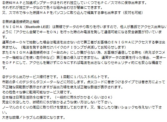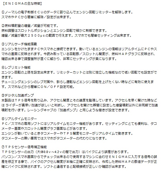 インジェクションコントロールサブコン「ENIGMA」Bluetooth/Bluetooth LE接続モデル アンドロイド/iOS両方に対応します。アンドロイド端末、iOS端末とWindowsPCに接続可能です。MACには接続不可同じ燃調MAPをEnigmaを介してPCとスマホで共用出来ます。当製品はインジェクション制御のスーパーカブ50 AA04のノーマルECUに割り込み接続することにより、優れた燃料制御性能を発揮します。今まで出来なかったさまざまなセッティングや変更が出来るようになります。全てのコントロールはパソコン画面かスマートフォン(iOS端末またはアンドロイドスマホ)で行えます。DILTS製品はインジェクション制御のスーパーカブ50 AA04のノーマルECUに割り込み接続することにより、優れた燃料制御性能を発揮します。今まで出来なかったさまざまなセッティングや変更が出来るようになります。全てのコントロールはパソコン画面かスマートフォン(iOS端末またはアンドロイドスマホ)で行えます。専用のENIGMA操作用ソフトウェアー/説明書はディルツ社HPより無料でPCにダウンロード出来ます。スマートフォン用アプリiOS版はApp Storeから、アンドロイド版はGoogle Playよりダウンロード(有料)して下さい。(各説明画面をよく読んでお間違えの無いようお願い致します)※PC用ソフトウェア及びスマートフォンアプリはAA01 カブ/リトルカブ用と共通です。注意※当製品はAA04カブ専用です。AA04型以前のカブ(AA01カブ/リトルカブ)には対応しません。AA01カブ/リトルカブ」には専用ENIGMAが御座います。専用のENIGMA操作用ソフトウェアー/説明書はディルツ社HPより無料でPCにダウンロード出来ます。スマートフォン用アプリiOS版はApp Storeから、アンドロイド版はGoogle Playよりダウンロード(有料)して下さい。(各説明画面をよく読んでお間違えの無いようお願い致します)※PC用ソフトウェア及びスマートフォンアプリはAA01 カブ/リトルカブ用と共通です。