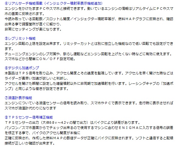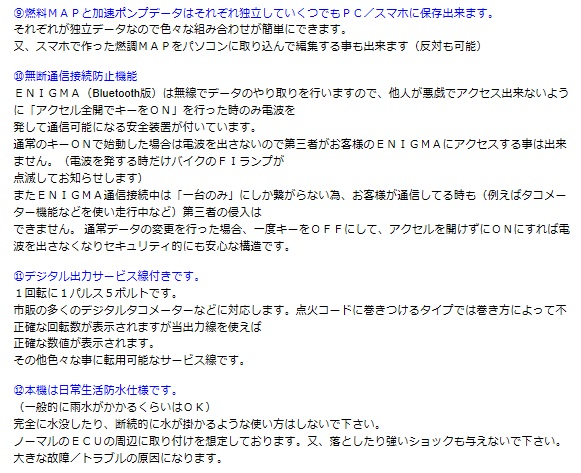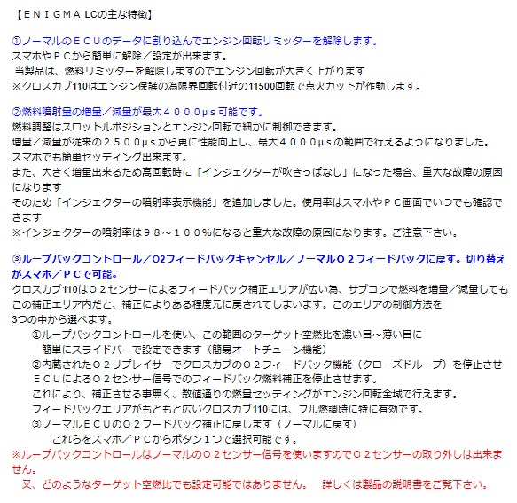 Enigma タイプLC Ready to FitBluetooth接続 PC & iOS & Android対応PC用Enigma LC専用ソフトウェア(無料)から無線接続で操作ができます。iOS(iPhone)用アプリ、アンドロイド用アプリから全ての操作ができます。(スマホ用アプリは有料となります)ディルツ社ダウンロードページのリンク先からソフトやアプリをダウンロードしてください。 RTFタイプはカブ110/クロスカブ110のECUに完全カプラーONでワンタッチ取り付け可能なモデルです。操作はスマホやパソコンから無線接続で簡単に行えます。ハンダ付け作業などが不要の為、配線接続のミスが無く、作業はとても簡単で、ECUをカプラーに繋ぐだけです。配線接続作業がない為、取り付け作業時間が大幅に短縮できます。当製品はクロスカブ110のノーマルECUに割り込み接続することにより、 優れた燃料制御性能を発揮します。今まで出来なかったさまざまなセッティングや変更が出来るようになりますインジェクションコントロールサブコン「ENIGMA」に新しく「ループバックコントロール機能」を追加し、ノーマルのO2フィードバック補正(14.7)をパワー型の「濃い目」〜燃費型の「薄い目」にスマホやPCから、スライドバーを使いターゲット空燃比を簡単に設定できます(簡易オートチューン機能)また従来の「O2リプレイサー」機能も搭載していますので、O2フィードバックを停止させてしまう事も可能です。ボアアップ時やマフラー/スロットルを交換した場合のフル燃調に特に有効で、エンジンブレーキ軽減セッティング等の、エンジン特性の調整時などでもお勧めです。もちろんノーマルのO2フィードバック補正に戻す事も、配線などを触らずにスマホ/PCから出来ます。Bluetooth /Bluetooth LE接続モデル アンドロイド/iOS両方に対応します。アンドロイド端末、iOS端末とWindowsPCに接続可能です。MACには接続不可同じ燃調MAPをEnigmaを介してPCとスマホで共用出来ます。専用のENIGMA操作用PCソフトウェアー/説明書はディルツ社HPより無料でPCにダウンロード出来ます。スマートフォン用アプリiOS版はApp Storeから、アンドロイド版はGoogle Playより基本アプリ(無料)をダウンロードして下さい。その後、各車種専用の「車種データ(約有料)」を選んでダウンロードして下さい。基本アプリ+車種(クロスカブ)データで使用出来る様になります。(詳しくは説明書をご覧下さい)※バイクを複数お持ちの方はスマホの基本アプリ1つに複数の「車種データ」を登録できます。※車種アプリは一度購入されると変更は出来ません各説明画面をよく読んでお間違えの無いようお願い致します。※一度購入されたアプリは機種変更後も同じIDで登録されていれば再ダウンロードできます。データは移行できませんのでEnigmaから読み込みしてください。注意2018年モデル(2016年度排ガス規制対応モデル 2BJ-JA44/45)には対応しません。