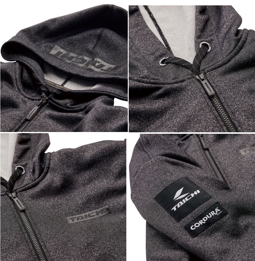 CORDURA 混紡ニットを使用した高強度スウェット生地のため、ストリート向けのデザインでありながら安全性も確保しています。フードのコードはジャケット内側のホックで固定し、走行時のバタつきにも対応しております。材質 表地:ポリエステル 66%:ナイロン 34%/裏地:ポリエステル 100%