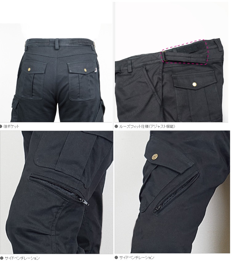 厚手ながらストレッチ素材でつくられた6ポケットのカーゴスタイルパンツ。穿いて安心の厚みを確保しながら、ストレッチすることで動きを妨げずツーリングでのアドバンテージを確保。腰、膝には脱着式プロテクターを標準装備、右腿のポケットはステップに足を載せたままでの使い勝手が良いようオフセットしたバイカーパンツ仕立てになっています。もも部にベンチレーションを備え猛暑にはダイレクトエアを導入し火照った体を強制空冷します。快適なライディングパンツルーズフィットタイプに加えショート丈仕様、ウィメンズサイズも用意した豊富なサイズ設定。MATERIAL:ポリエステル、コットンPROTECTOR:腰、膝(CE規格)パッド標準装備(着脱可能)Men's SIZE(inch):LW-short(34-40)