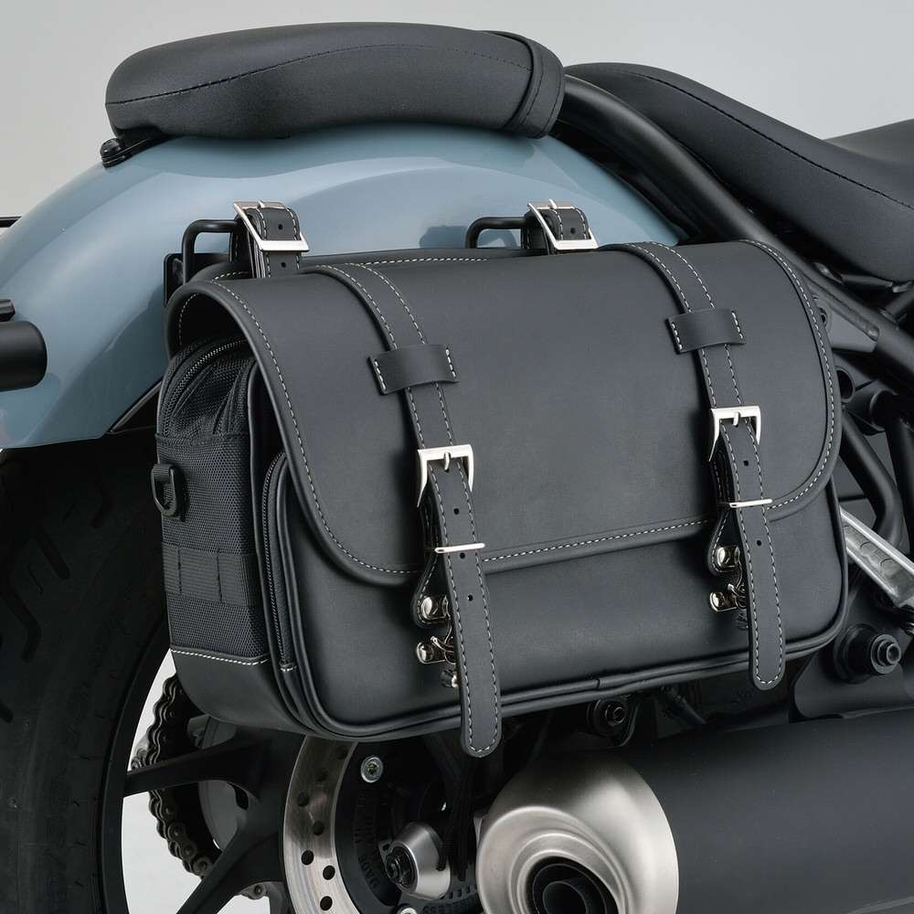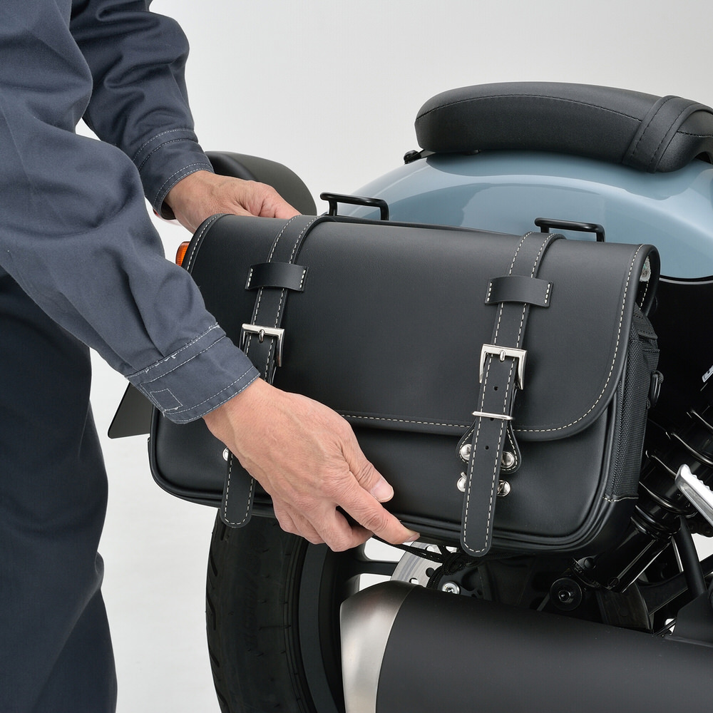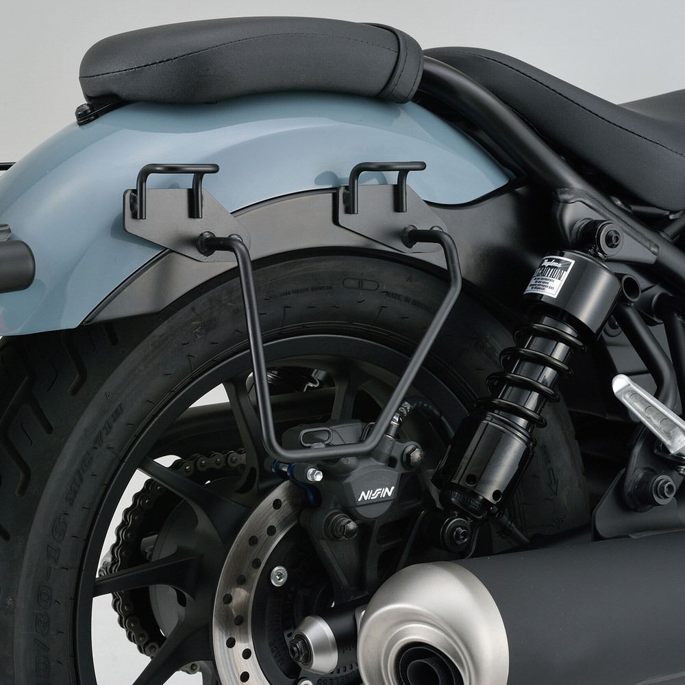 サドルバッグを装着しやすいようにベルト掛け部分を一体化した、サドルバッグハンガー不要のサドルバッグサポート。従来品(95224)よりバッグ差込部を短く(従来対比:-60mm)して、サドルバッグを脱着しやすくしました。バッグがリアサスに接触しにくい形状で、サドルバッグサポート自体の脱着も簡単。ベルトの間隔が200mm前後のサドルバッグに最適です。ベルト掛け部分にはネットやストレッチコードを掛けることもできます。右側専用品(REBEL250(17〜19)MC49/500REBEL500(17〜19)PC60共通)ベルト掛けループ一体型(バッグハンガー不要)取付ボルト付属(M8×22、2本)材質:スチールマットブラック塗装※グラブバーキャリア(96614)と組み合わせる場合、別途バッグサポート取付キット(97065)が必要です。※9Lサドルバッグ(96906)との同時装着推奨。※社外マフラー装着車の場合、バッグとの干渉により装着不可の場合があります。※バック底面からマフラー間は50mm以上確保してください。
