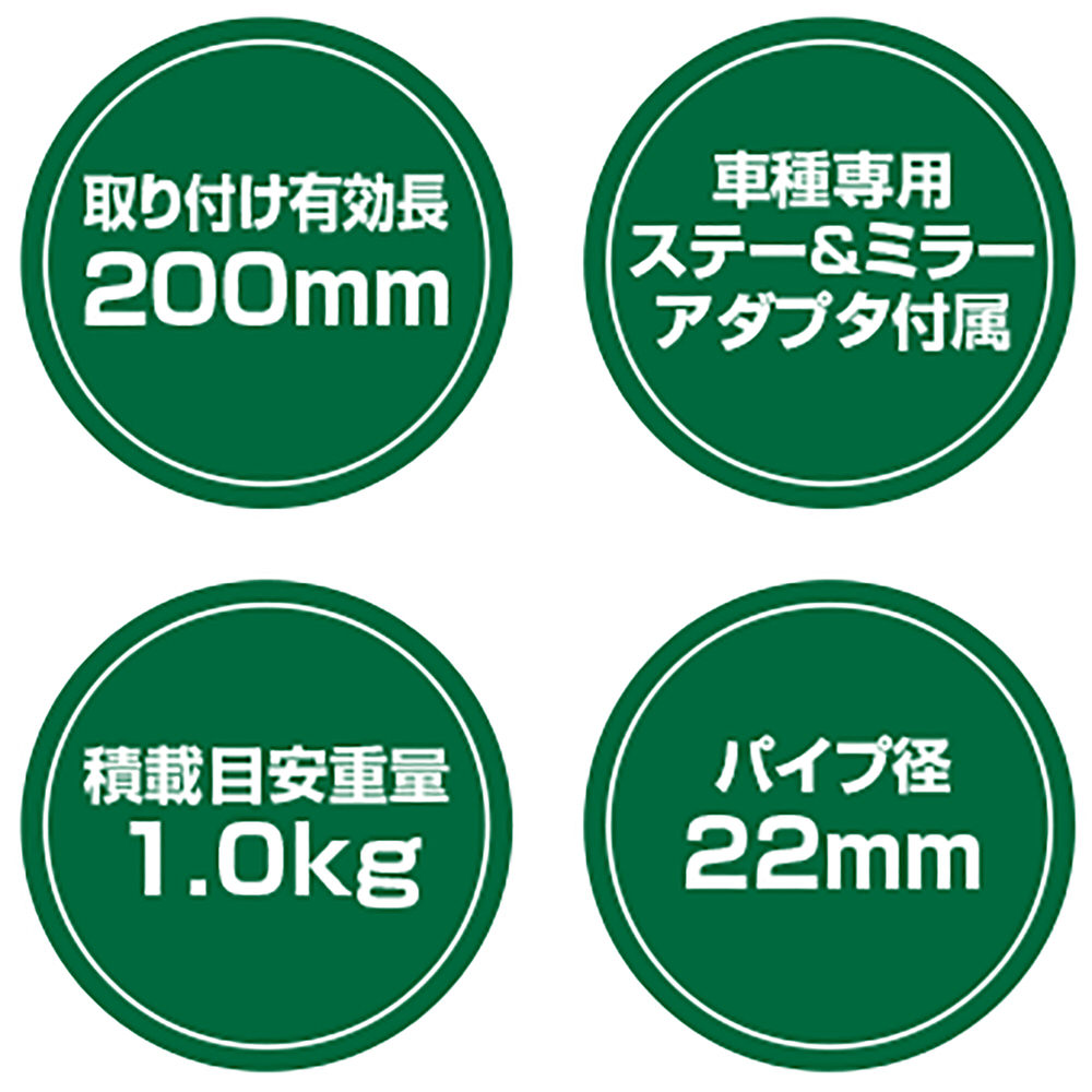 ボルトオンで簡単に取り付けできるマルチマウントバー。φ22.2のパイプに様々なアイテムのマウントが可能。パイプ部、ステー:スチール黒塗装取付部:マスターシリンダークランプ取付穴
