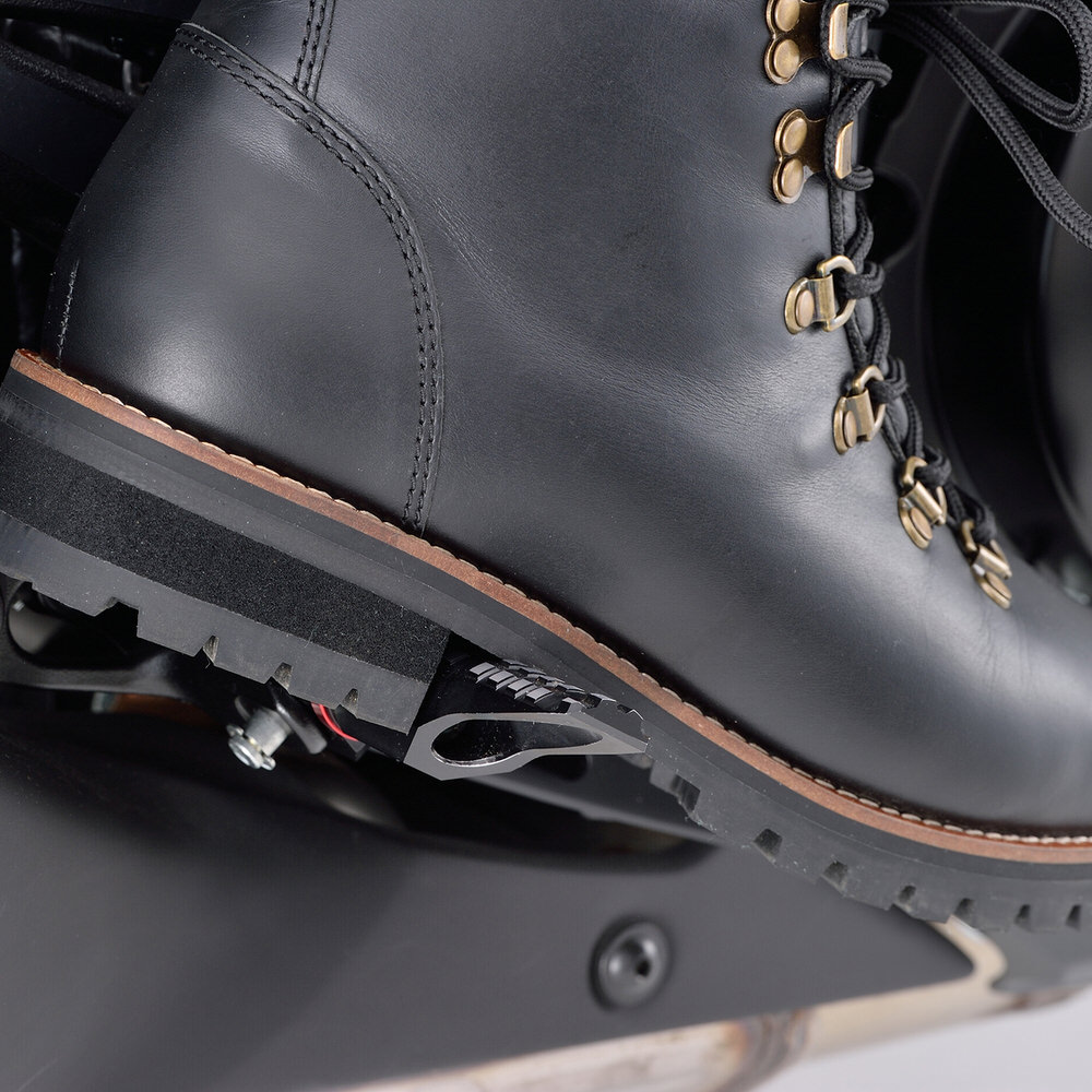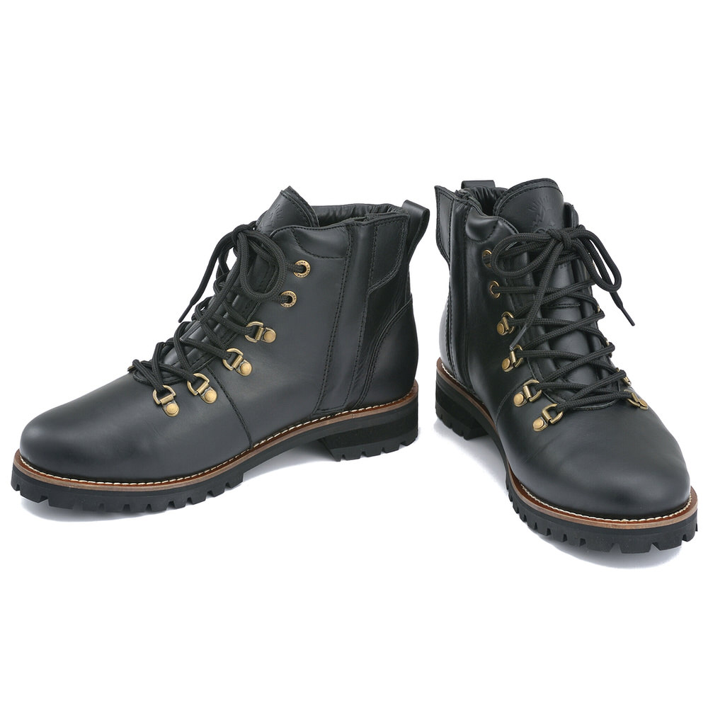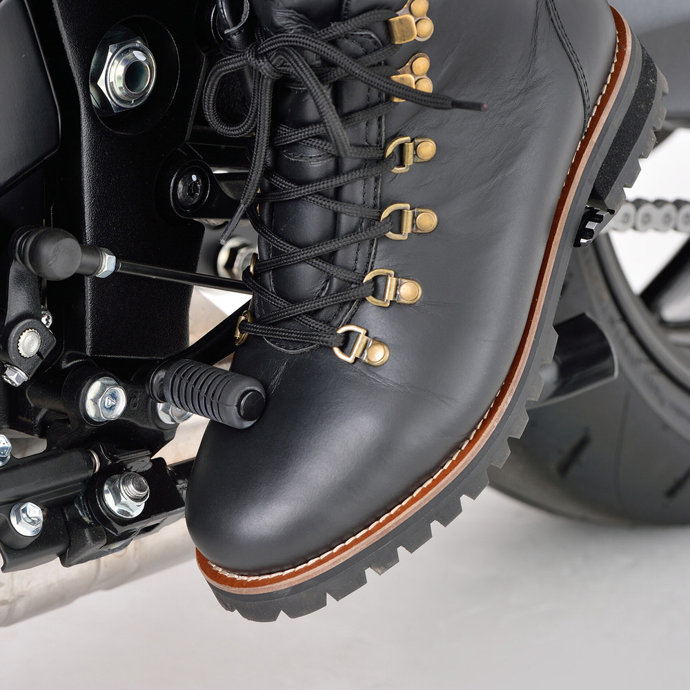 マウンテンブーツをモチーフとしたバイク用ブーツ。普段履きでも使えるアウトドアに適したデザインでバイク乗車を考えた機能を確保。脱着しやすいサイドファスナー式。シフトパッド、くるぶしパッド内蔵。ソールのステップ部に滑り止め加工。内側の金具はハトメに変更し愛車を傷から守ります。3E相当幅広設計。※防水機能はありません。