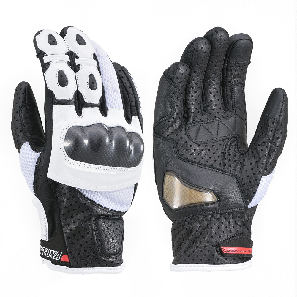 本革の安全性×高通気性。スポーツタイプの夏用フラッグシップモデル。パンチングゴートレザーとメッシュ生地を使用し高い通気性と安全性を確保。転倒時、手の平の衝撃を滑らせて逃がすパームスライダー装備。タッチパネル対応。素材:本革(やぎ革)プロテクター:カーボンパームスライダー:TPU
