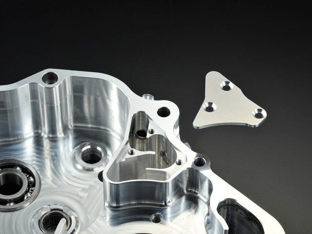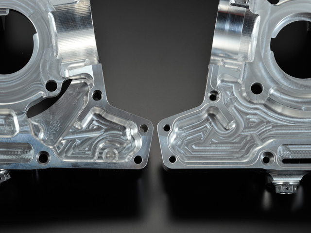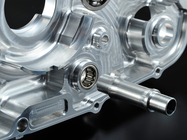 ついに完成したアルミ削り出しクランクケース。クランクケースオイル容量が約100cc増えた「アルミビレットクランクケースAGO」です。A5083材の無垢材から削り出します。124ccのΦ54ピストンに対応するため、ボア径は57mmに広くなっています。ハイパワーエンジンに対応するため必要な部分の厚さは増やしています。とくに割れ易いクランクケース上側の厚みは、純正の3mmに比べ2倍の6mmという厚みに設定しています。オイル容量が増えるということは、容積が増えるためエンジンの冷却にも効果があります。さらには見た目のカスタム感もアップします。アルミビレットクランクケースは、紙のセンターガスケットを使用しません。薄く液体ガスケットを塗布して使用します。紙のガスケットを使用しないため、ケースの剛性は高まります。