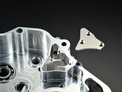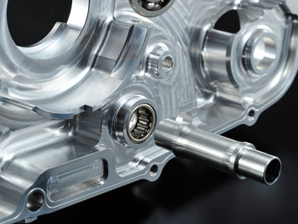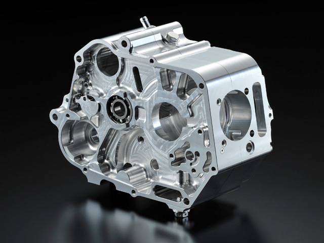 ついに完成したアルミ削り出しクランクケース。材質にはA5083材を使用しています。124ccのΦ54ピストンに対応するため、ボア径は57mmに広くなっています。ハイパワーエンジンに対応するため必要な部分の厚さは増やしています。とくに割れ易いクランクケース上側の厚みは、純正の3mmに比べ2倍の6mmという厚みに設定しています。アルミビレットクランクケースは、紙のセンターガスケットを使用しません。薄く液体ガスケットを塗布して使用します。紙のガスケットを使用しないため、ケースの剛性は高まります。