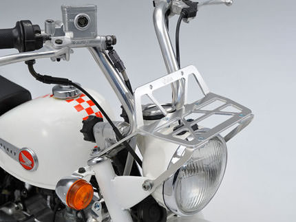12Vモンキーのヘッドライト上部に装着するアルミ製のビレット製キャリアです。自転車用のカゴなどを装着し積載性の向上が可能です。最大荷重3kgまで。※12Vモンキー専用※AB27 FIモンキー装着可【材質】 A5052材【表面処理】 シルバーアルマイト仕上げ