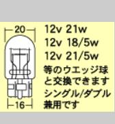 定格&口金形状:ウインカー用 ウエッジ(大) オレンジLED×20個 ランプ裏側から取付ける車種は挿入穴径が26mm必要です。 シングル/ダブル兼用型 差込:W3×16q、W3×16d色:シングルダブル兼オレンジモデルウインカー、ウインカー/ポジション用(クリア レンズ、オレンジ色レンズ共用)Lビーム オレンジモデルが新採用のLEDと新設計の回路で大幅パワーアップして新登場。 高拡散のディフューザーフラットLEDを使用することにより、従来品よりも横方向の光の広がりがアップ。ウインカー用 オレンジモデル クリア レンズ、オレンジ色レンズ 兼用12V用 車検対応 各品種 1個入り 日本製