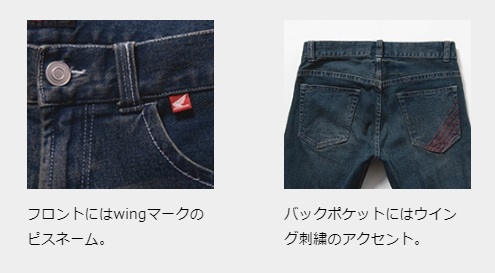 操作性にこだわりながらもストレッチデニムでスタイルアップストレッチデニム素材を使用、細身ストレートシルエットのデニムパンツ。フロントに3箇所/バックに2箇所の5ポケットのオーセンティックなパターン。フロントはピスネーム。バックポケットはハネをモチーフにした刺繍。素材表地:コットン98%/ポリウレタン2%(ストレッチデニム)プロテクター標準装備:EVAソフトプロテクター(ニー用)
