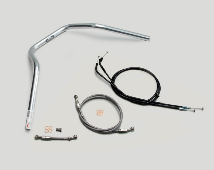 ハンドルと必要なケーブル&ホースSET付属 スロットルケーブル・クラッチホース・ブレーキホース別途 ハーネスの延長、ハンドルの穴開け加工が必要、サイドキャップ(内径φ18mm)が必要