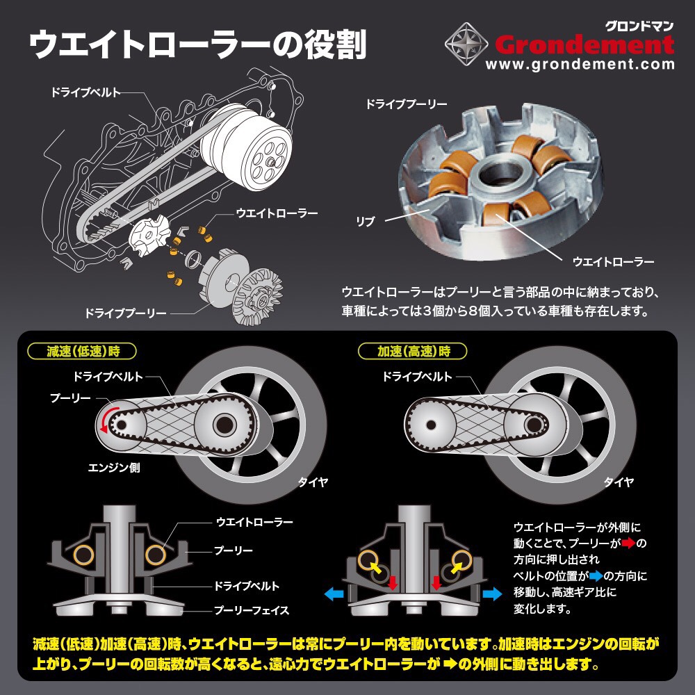 【注意事項】※画像は参考です。純正標準の重さをお調べの上、車両の状態やカスタム状況に応じて重量をお選び下さいまた、稀にメーカーのマイナーチェンジや、社外のハイスピードプーリー装着車はウエイトローラーのサイズが違う場合が御座います現車を御確認の上お買い求め下さい。主な仕様:17×12mm 8.5g(3個入)ウエイトローラーはプーリー(プーリーは駆動系部品の一部)の中に装着する部品、プーリーが回転するときに遠心力でウエイトローラーが転がり変速を可能としています。ウエイトローラーはその名の通りウエイト(重り)ローラー(転がる)といる2つの役割を持ち、重さを変化させることで変速のセッティングを変更することが出来ます。グロンドマンのスーパーウエイトローラーはウエイトローラー樹脂部分に品質の高いプラスティックを使用することで耐摩耗性、耐熱性向上。駆動系のセッティングやメンテナンスに使用しやすい重さをラインナップしています。【重要】【消耗部品】ウエイトローラーは5000km〜1万キロでの交換が必要な消耗部品です。樹脂の部分が摩耗しサイズが小さくなりますと、アクセルを開けてもスピードが出ない、加速が遅くなった等、燃費にも関わりますので、定期的な点検、交換を行ってください。点検時にはスライドピース、ドライブベルト等、同時期に消耗する駆動部品の同時交換をお勧め致します。同時交換をすることで、相乗効果となり各部品の寿命、パフォーマンスが保たれ、スクーター本来の性能に向上します。【対応純正品番】【21650-32G20 SIZE:17×12mm 12.0g】【21650-41D40 SIZE:17×12mm 14.0g】【21650-41D60 SIZE:17×12mm 14.5g】【21650-32G40 SIZE:17×12mm 6.5g】【21650-41D50 SIZE:17×12mm 7.5g】【21650-04C10 SIZE:17×12mm 8.5g】【21650-32G00/21650-41D21 SIZE:17×12mm 11.0g】【21650-32G10/21650-32G11 SIZE:17×12mm 11.5g】【21650-41D12 SIZE:17×12mm 12.5g】【21650-46F30/21650-46F40 SIZE:17×12mm 14.0g】主な適合車種:レッツ(CA1KA-100001〜308836)(6.8g)、レッツ(CA1KA-308837〜)(14g 3個)、レッツ2/G/DX/L(CA1KA-131220〜)(14g 3個)、レッツ2/L/コンビブレーキ/スタンダード(CA1PA-100001〜)(14g 3個)レッツ2スタンダード(CA1PA-216793〜)(8.5g)、レッツ2/S(CA1KB)(14.0g)、レッツ2/S(CA1PC-100001〜)(8.5g)ZZ(CA1PB-100001〜)(8.5g)、ヴェルデ(CA1MA/CA1MB)(14.0g)、セピアZZ(AJ50)(CA1HC)(6.5g)、ストリートマジック(TR50)(CA1LA)(7.8g)ストリートマジック(TR50S)(CA1LB)(7.8g)、ストリートマジック2(TR50SD)(CA1LB-111571〜)(7.8g)、ストリートマジック2(TR50SD)(CA1LB-116027〜)(8.6g)、ストリートマジック110/-2(CF12A)(20.0g)アドレスV100(CE11A)(12.5g)、アドレスV100/S(CE13A)(14.8g)、アドレス110(CF11A-100001〜112192)(20.0g)、アドレス110(CF11A-112193〜439999)(18.5g)アドレス110(CF11A-500001〜)(20.0g)