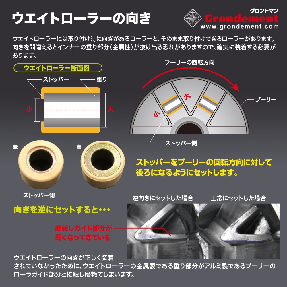 【注意事項】※画像は参考です。純正標準の重さをお調べの上、車両の状態やカスタム状況に応じて重量をお選び下さいまた、稀にメーカーのマイナーチェンジや、社外のハイスピードプーリー装着車はウエイトローラーのサイズが違う場合が御座います現車を御確認の上お買い求め下さい。主な仕様:20×15mm 17.0g(3個入)ウエイトローラーはプーリー(プーリーは駆動系部品の一部)の中に装着する部品、プーリーが回転するときに遠心力でウエイトローラーが転がり変速を可能としています。ウエイトローラーはその名の通りウエイト(重り)ローラー(転がる)といる2つの役割を持ち、重さを変化させることで変速のセッティングを変更することが出来ます。グロンドマンのスーパーウエイトローラーはウエイトローラー樹脂部分に品質の高いプラスティックを使用することで耐摩耗性、耐熱性向上。駆動系のセッティングやメンテナンスに使用しやすい重さをラインナップしています。【重要】【消耗部品】ウエイトローラーは5000km〜1万キロでの交換が必要な消耗部品です。樹脂の部分が摩耗しサイズが小さくなりますと、アクセルを開けてもスピードが出ない、加速が遅くなった等、燃費にも関わりますので、定期的な点検、交換を行ってください。点検時にはスライドピース、ドライブベルト等、同時期に消耗する駆動部品の同時交換をお勧め致します。同時交換をすることで、相乗効果となり各部品の寿命、パフォーマンスが保たれ、スクーター本来の性能に向上します。【対応純正品番】【HONDA】【22123-KV8-315/22123-KV8-305 SIZE:20×15mm 14.0g】【22123-KCW-306 SIZE:20×15mm 16.0g】【22123-KWN-900 SIZE:20×15mm 18.0g】【22123-K12-930/22123-KWN-710 SIZE:20×15mm 19.0g】【22123-KZY-900 SIZE:20×15mm 21.0g】【22123-KZY-901 SIZE:20×15mm 22.0g】【SUZUKI】【21650-33G80 SIZE:20×15mm 15.0g】【21650-21F30/21650-33G00 SIZE:20×15mm 17.0g】【21650-33G60 SIZE:20×15mm 19.0g】主な適合車種:LEAD125(JF45)、スペイシー125(JF03)(JF04)、PCX125(JF28)(19.0g)、PCX125(JF56)(18.0g)、PCX150(KF12)(WW150C/J)(21g)PCX150(KF12)(WW150/D(2J)/E(J/2J)(22g)、PCX150(KF18)(18g)、アドレスV125/-G(CF46A)(16.8g)、アドレスV125G(CF4EA)(19.0g)、アドレスV125S(CF4MA)(19.0g)リード125(18g)、スペイシー125(16g)