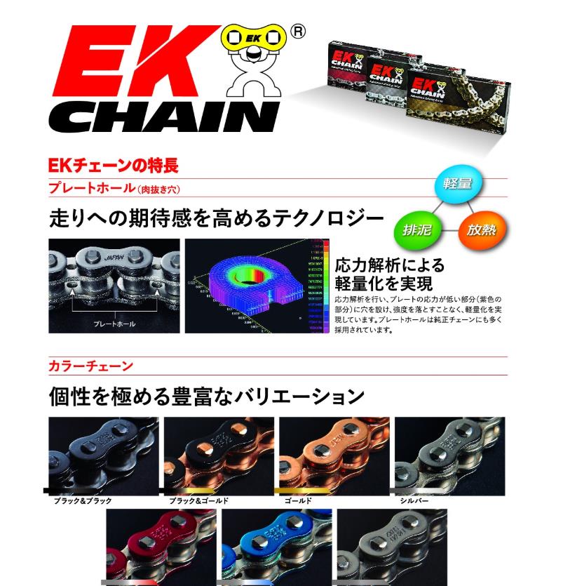 長寿命を保証するソリッドブシュ高耐久ソリッドローラ四方かしめピン特殊合金プレート軽量化のための内プレート穴採用特殊PTFEグリースは粘着力に優れ、耐摩耗性向上に貢献江沼製作所EKシールチェーン 530ZVX3シリーズチェーンサイズ:530リンク数:130L外プレート×内プレート:メタルレッド×ニッケルシルバージョイントタイプ:MLJ(カシメジョイント)