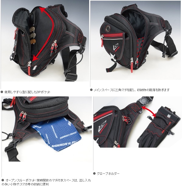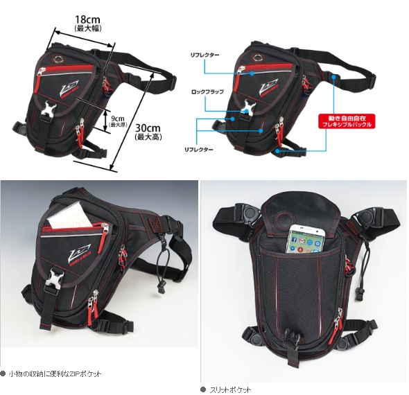 メイン気室は高さ約30cm、最大横幅18cmに加え、5箇所のポケットを持つ収納力に秀でたホルスターバッグです。メインバックルにアルミタイプを採用したメカニカルデザインは、メタルの塊であるバイクにフィット。ウエストベルトのジョイントバックルは120°フレキシブルに可動し、乗車時はもちろん、歩行時にもストレスフリーのつけ心地です。降車時に便利なグローブホルダーは、左右どちら側でも取付可能な親切設計。SIZE:W18×D9×H30cm(メインスペース最大)容量:4リットル