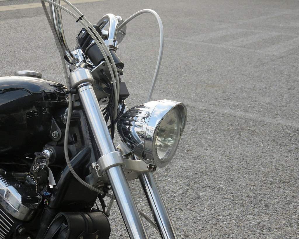 ネオファクトリー社の008425 ヘッドライトボトムマウントブラケット 39mmフォーク用を併用する場合は、000950 5-3/4in ヘッドライトブロック クロームを別途ご用意ください。