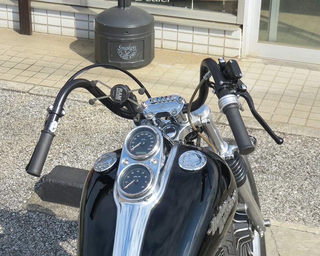 色:ブラックサイズ:全幅:約570mm 高さ:約230mm プルバック:約280mmエンドライズ:約165mm 取り付け可能幅:約140mm適合車種:1インチバー採用のほとんどのハーレー素材:スチール内容物:ハンドルバー×1本注意事項:ロットによっては皮膜が厚い為、純正のようにグリップエンド部分の塗装を剥がしている物があります。写真はヘコミ有りです。商品説明:チョッパーにジャストの幅の狭いスタイルのハンドルバーです。ちなみにヘコミとは配線の逃げのことです。〜82年式まではヘコミ無し、それ以降はヘコミ有りを使ってください。