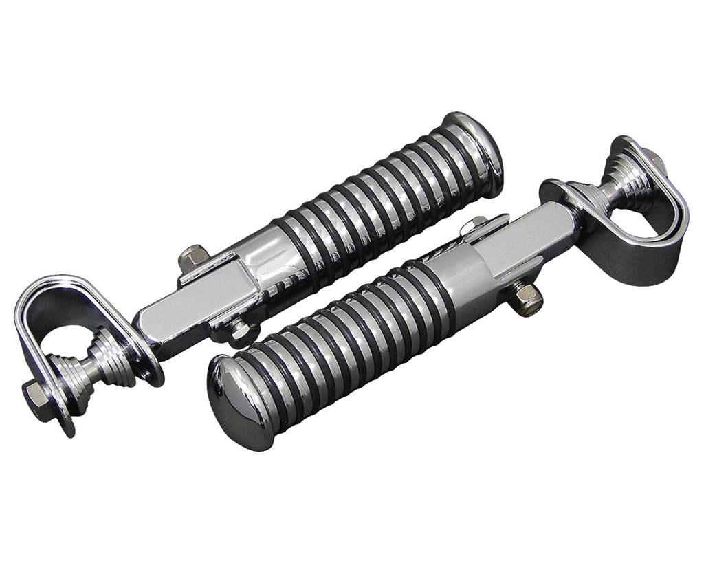 サイズ:マウントクランプ部:1インチ及び7/8インチボルトサイズ:3/8-24ボルトの長さ:約2インチ(ネジが切ってある部分の長さ:約1-1/4インチ)適合車種:汎用品素材:スチール&ラバー内容物:フットペグ左右×1セット注意事項:フレーム等に直接マウントすると傷の原因になります。ゴムを入れる等、対策を施して下さい。商品説明:色々な所にマウント出来るフットペグです。カスタムの際には重宝しますね。マウントサイズも1インチと7/8インチが選択出来るので、アイディア次第で使ってください。