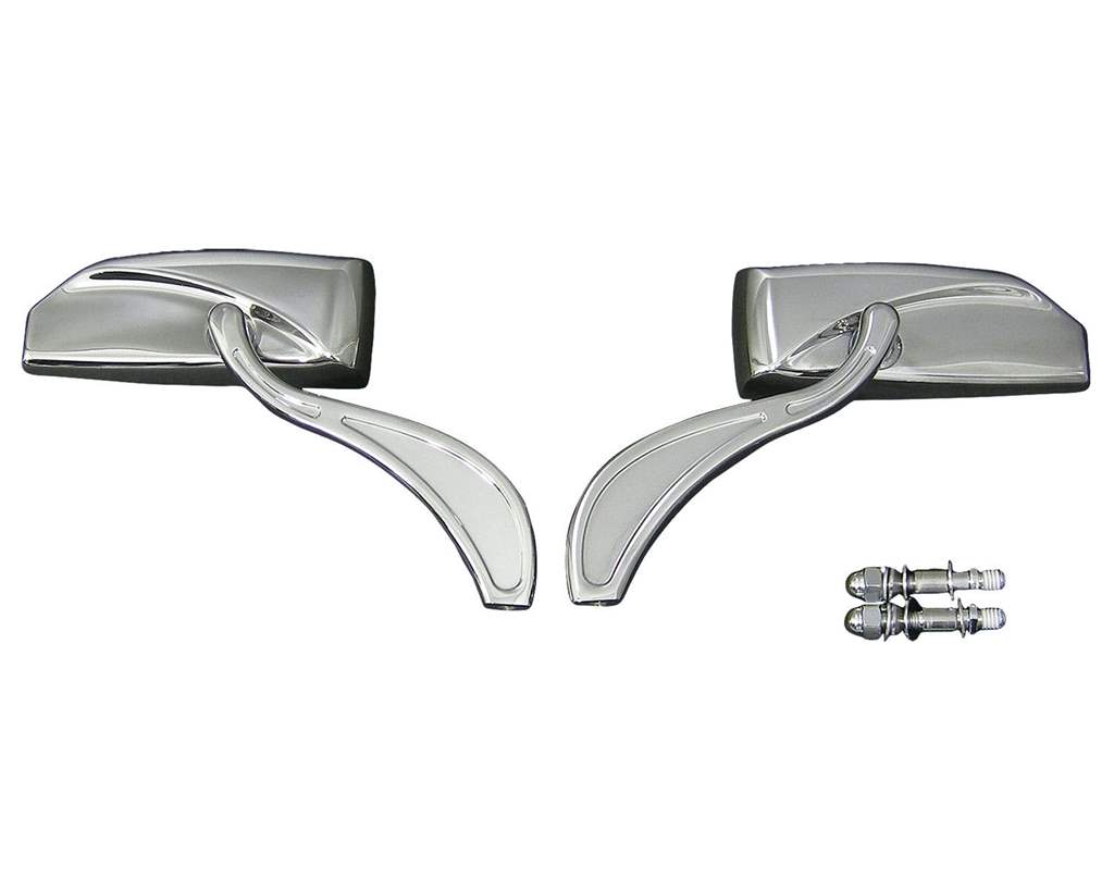 色:クロームサイズ:ミラー: 縦約53mm 横約133mmステー: 約155mm素材:スチール&ガラス内容物:ミラー×左右セット、取り付けボルトセット×2注意事項:左右セット販売です。片側単品販売は行っておりません。ミラーの下にウインカーを取り付ける事は出来ません。商品説明:ハイテック、ユーロスタイルにマッチするミラーです。存在感ありますよ!こちらのミラーは左右セットとなります。04年式以降のXLにはウインカー移設なしで取り付け可能です。