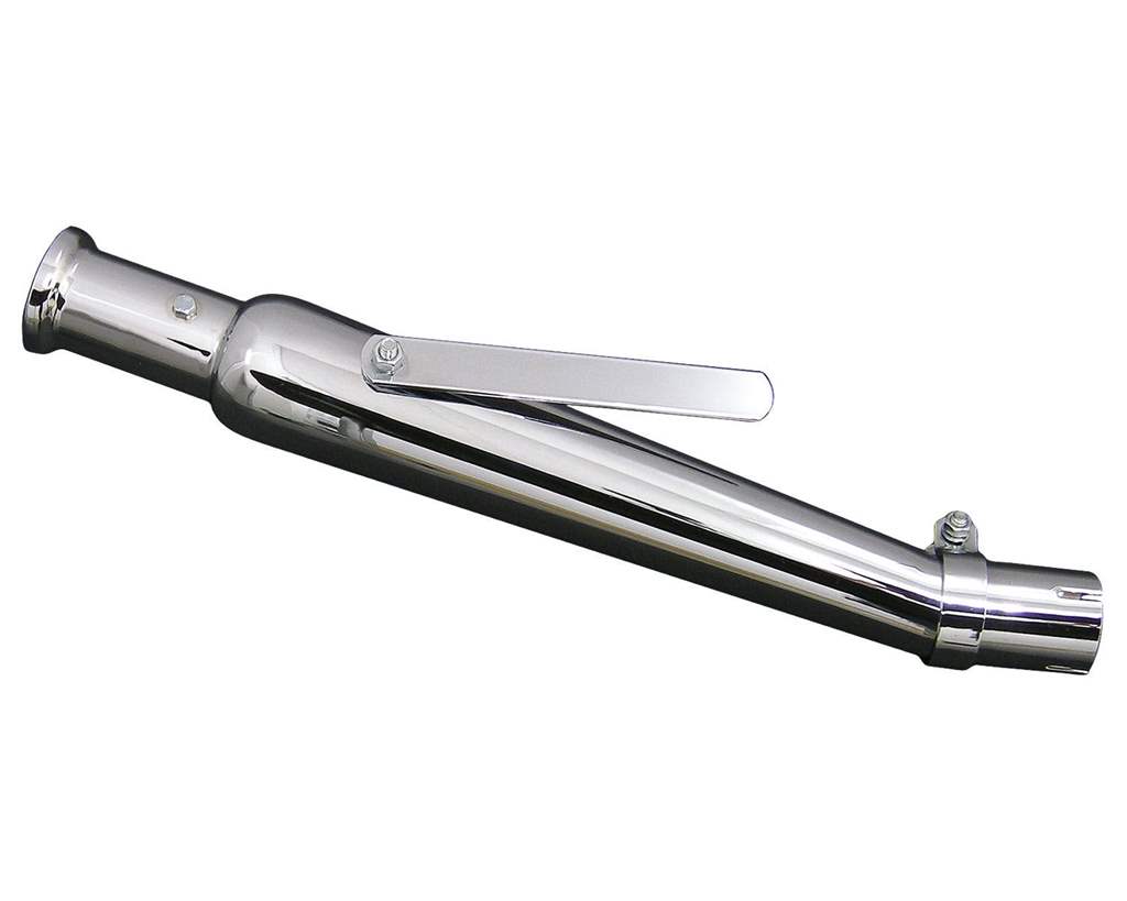 色:クロームサイズ:全長約510mm 取り付け部外径約48mm外径(一番太い所)約70mm エンド部約64mm 跳ね上げ角度約18°対応口径:1-1/2in(約38mm)〜1-3/4in(約45mm)リデューサーS外径40mm M外径43mm L外径46mmインナーサイレンサー全長:約7-1/8in(約180mm)素材:スチール内容物:マフラー本体×1本 クランプ×1個インナーサイレンサー×1リデューサー×3個(S,M,L)注意事項:インナーサイレンサー取り外し可能この商品は汎用品の為取り付ける際にステー等の加工が必要になります。(ネオファクトリー社では取り付けに関する御質問等には御案内致しかねます。)車検に対応しておりません。公道使用不可。商品説明:エンド部分がラッパのように開いた形状が特徴のマフラーエンドです。スペーサーを使用することで1-3/4in(約45mm)〜1-1/2in(約38mm)に対応します。オールドスクールチョッパーなどヴィンテージカスタムに良く似合います。かっこよく仕上げてください。 サイレンサーを固定している部分が丁度2インチサイズなので、ショートの2インチ用インナーサイレンサーに付け替え可能です。