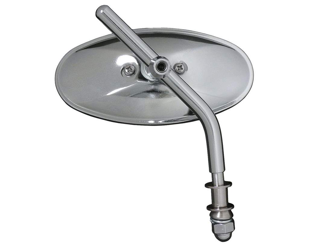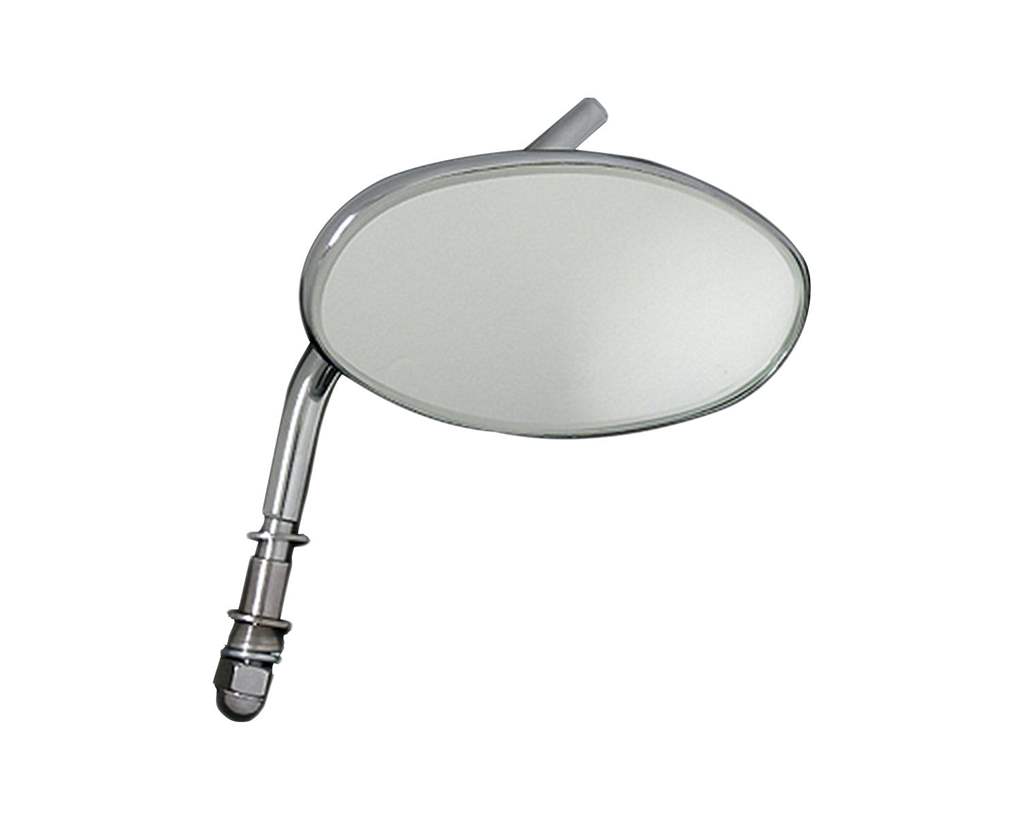 色:クロームサイズ:ミラーサイズ 縦:約63mm 横:約125mmステー 全長:約125mm(取り付け部除く)移動可能幅:約85mm素材:ミラー部:ガラスボディ:スチール内容物:ミラー本体×1個注意事項:左右兼用です。商品説明:スタンダードなオーバル(楕円形)のミラーです。純正は大きくてかっこ悪い、ハンドル周りをすっきりさせたい。そんな人にお勧めです。EVO以降の純正ハンドルマウントのウインカーも使用可能です。ミラーとステムは芋ネジで固定するタイプですので、位置の調整が可能です。ネオファクトリー製ミラークランプと組み合わせれば国産バイクにも使用可能です。