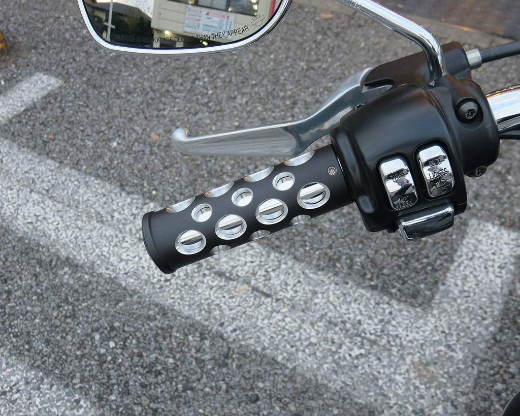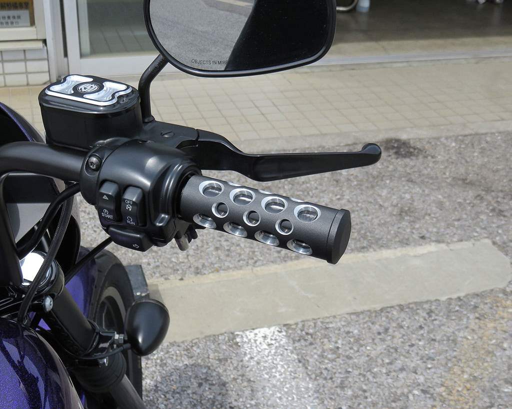 色:艶消しブラックとポリッシュのコントラストカットサイズ:1インチバー用適合車種:1インチバーを使用する殆どのハーレー(電子制御スロットルを除く)素材:アルミ内容物:グリップ本体×2本(左右1セット) グリップ固定用芋ネジ×3個ハンドルエンド用ナイロンキャップ×1個 六角レンチ×1本注意事項:インナースロットルは必要ありません。穴が開いている部分はハンドルの表面が露出します。商品説明:カートゥーンに登場するチーズを連想させるような大小のパンチング処理が施されたカスタムグリップです。ハイテック系カスタムによく合う洗練されたデザインが魅力です。さらにスロットル側にはベアリングを装備しており、スロットル操作を軽くする工夫がなされています!