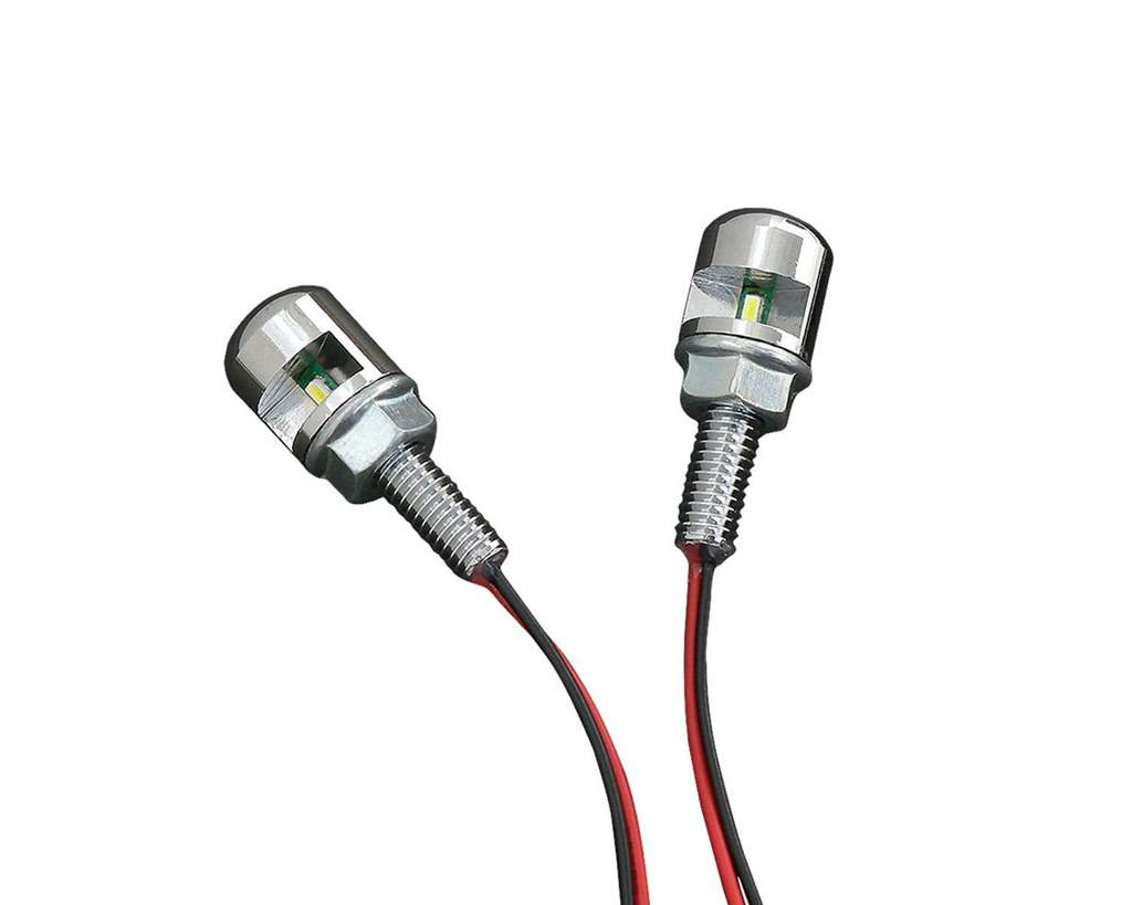 色:クロームサイズ:ネジのサイズ M6×1.0素材:スチール内容物:ナンバーライトスクリュー×左右1セット商品説明:ナンバー用のスクリューにLEDライトを埋め込んだ、シンプルなナンバーライトです。ナンバー灯の付いていないテールライトを付ける時には、これを使ってください。クロームのボディはどんなカスタムにも違和感を与えず、LEDの光は明るく見やすいのでカッコいいですよ。