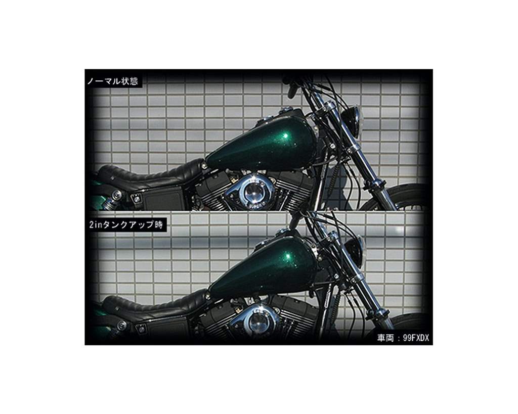 適合車種:97年〜17年式のダイナモデル(2006年以降、49mmフォークのFXDWGを除く)内容物:画像にてご確認下さい。注意事項:06以降のFXDWG(49mmフォーク採用車)はハンドルを切った際にタンクにトップブリッジがヒットする為、装着不可。ハンドルを切った際にタンクと干渉する箇所がある場合は、パーツの交換や加工、工夫等が必要です。※タンク傾きにより燃料計装着車は、残量表示が変化しますのでご注意下さい。各種ホースは必要に応じてご交換下さい。ホースの長さは写真と仕様が異なる場合がございますが、必要に応じて切ってご使用下さい。商品説明:ガソリンタンクを少し上に持ち上げるタンクアップマウントです。これをつけることで、タンクとエンジンに隙間が出来て、エンジンの造形がより際立って見えます。ヘッド部分を掃除しやすくなるというメリットもあるとか・・・。小さいパーツですが、車輌のイメージは結構変わるパーツです。