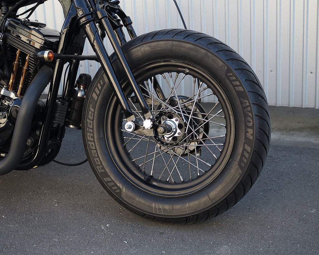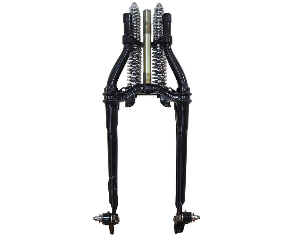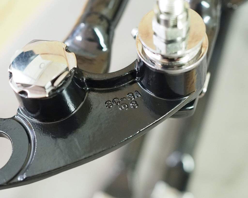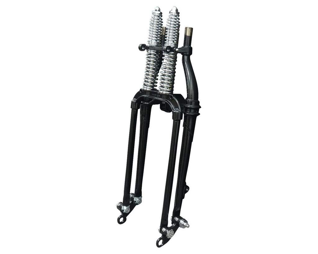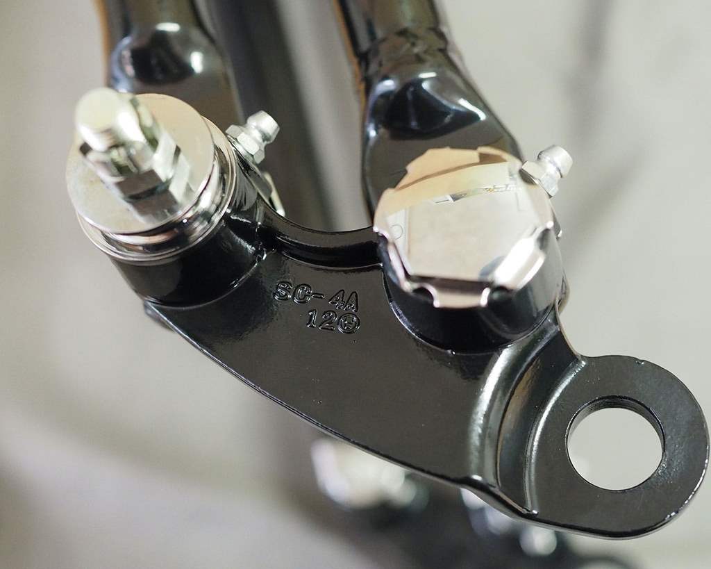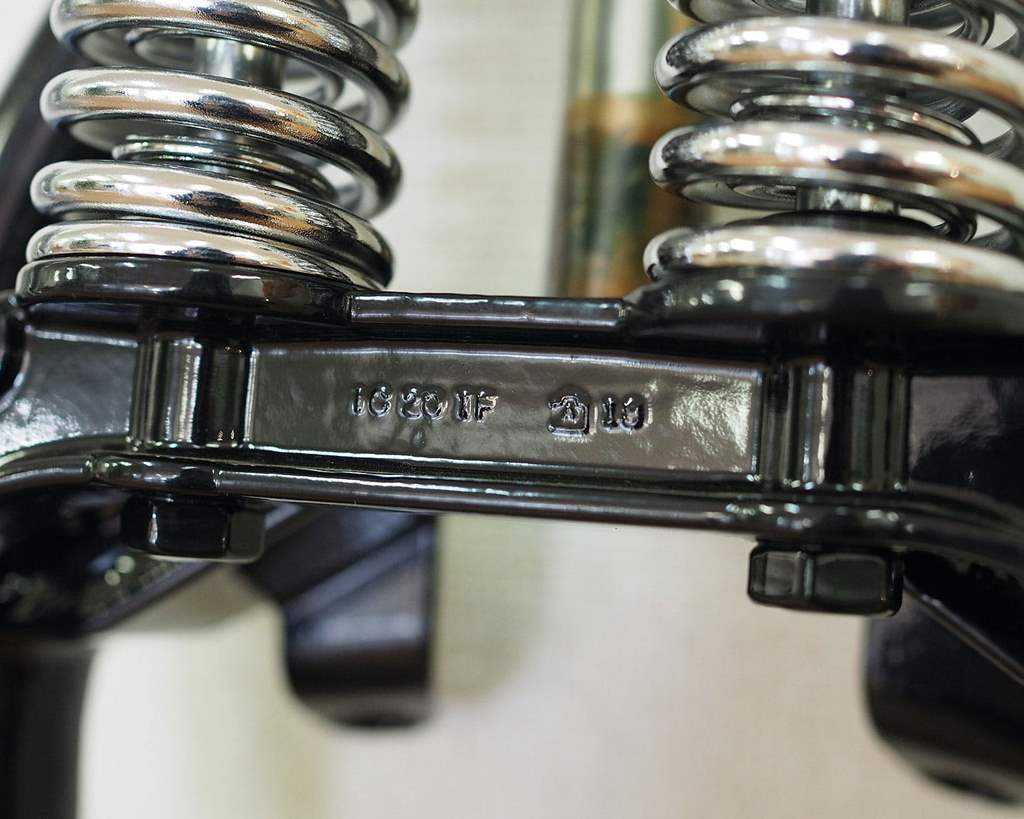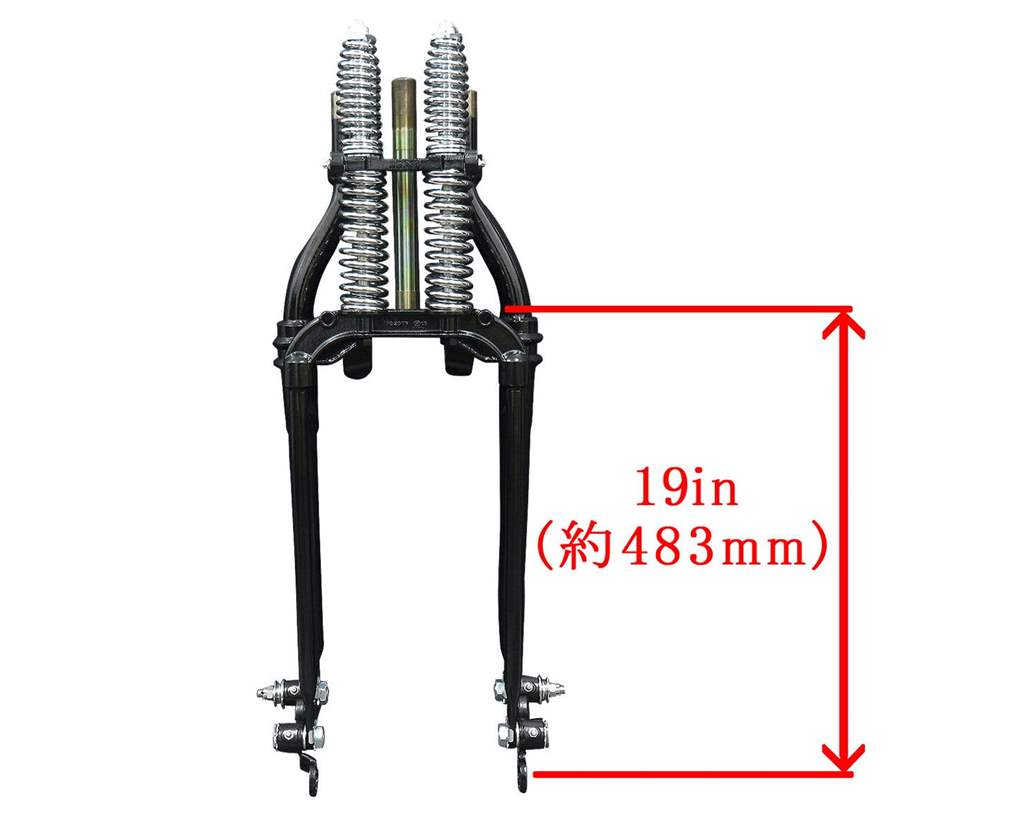 色:フォーク:ブラック スプリング:クロームサイズ:インラインのEye to Eye:120.32(米国仕様に準拠)左右レッグトップの雌ネジ:3/4-18(インチ規格)リアレッグトップ穴間:約1/2in適合車種:1936年〜1946年EL・FLその他1インチステムのカスタムバイク(流用の場合は加工が必要です)OEM品番:2601-36・45515-36素材:スチール内容物:スプリンガーフォーク×1本注意事項:・キット内容物は1枚目画像のものになります。組み付けには別途パーツをご用意ください。・当商品は耐久度や強度も 当時同等となっております。現代の道路事情に適した設計では御座いませんので、ご了承のうえご利用ください。・仕様によりライザー、ハンドルがタンク等へ干渉する場合があります。出荷状態は仮組みされています。装着前に分解・グリスアップを行って下さい。ベアリング関係の圧入やその他専門特殊工具を用いた技術を必要とする作業です、専門のショップにて施工をお勧め致します。こちらのフォークはオフセット無しのインラインタイプになります。左右レッグの雌ネジはインチ規格ですので、mm規格のアダプターは使用出来ません。商品説明:オールドハーレーに採用されていたスプリンガー、通称「74スプリンガー」のレプリカフォークです。74スプリンガーの中でも「インラインストレートレッグ」の仕様となります。当時の雰囲気を再現する為、フロントアームやロッカーアームのキャスティングまでこだわって復刻しました。数あるレプリカスプリンガーフォークの中でも、再現度の高い物となっています。フェンダー用タブはニーズを踏まえて、入手し易いV-TWIN製のレプリカフェンダーに合わせてある他、多くの米国製レプリカスプリンガーフォークに問題点として見られたグリス不足によるロッカーの焼き付きを、ロッカー部のインナーシャフト長を適切な長さに合わせて開発し直すことで、克服に成功しています。走行性能は当時同様ですが、スプリンガーのその独特なデザインは車両全体の雰囲気をヴィンテージなスタイルへと大きく変化させる為、根強い人気があります。レストアはもちろん、カスタムビルドにも最適です。