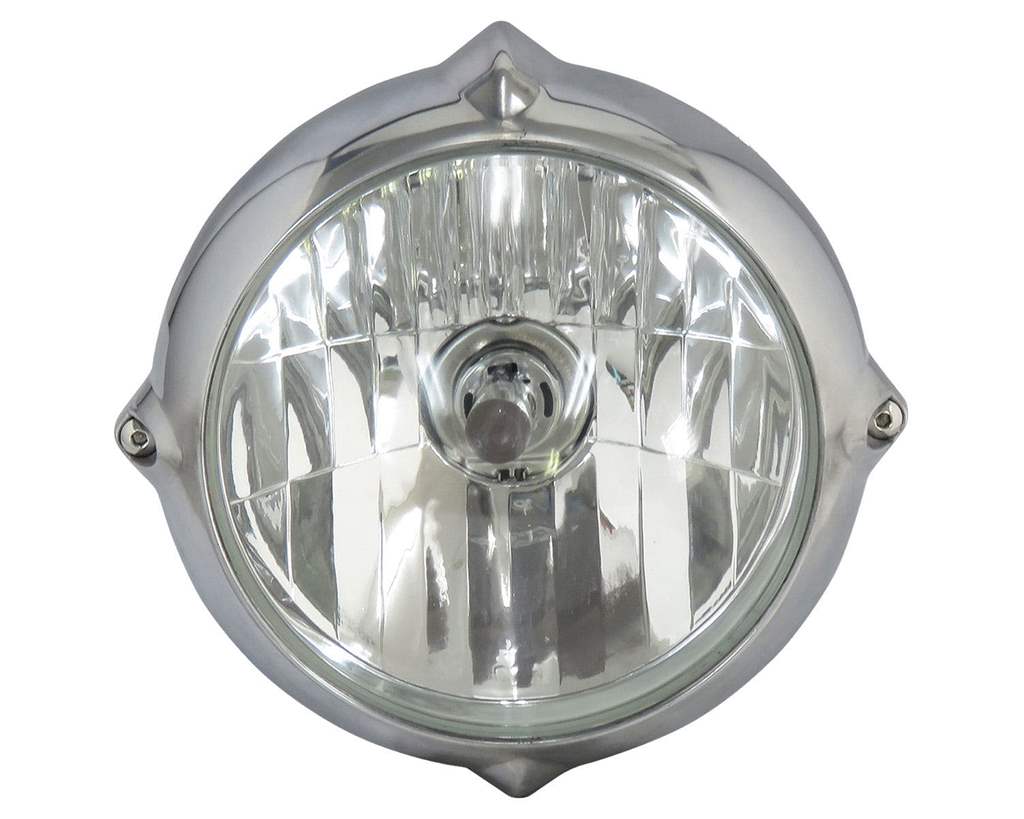 色:ポリッシュサイズ:5-3/4インチ適合車種:汎用素材:アルミ内容物:ヘッドライト×1注意事項:配線色HI:赤、LO:青、アース:黒商品説明:ヴィンテージの雰囲気が漂う4カ所のリブがアクセントのヘッドライトです。バックに向かう美しい曲線美は、現行の量産型には成し得ないデザイン性でしょう。オリジナル品には無かったマウントブラケットを設定。車体への取付が容易です。H4ハロゲンバルブ採用で、明るく、HI/LOWの切り替えも可能です。