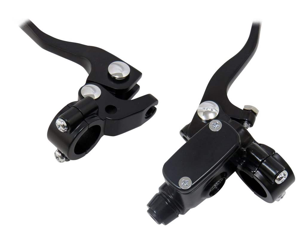色:ブラックサイズ:ボア径:9/16インチ クランプ:1インチバンジョーボルトサイズ:7/16-24ハンドルクランプ部ボルトサイズ:1/4-20×1in適合車種:1インチハンドルを装着した、4速および5速以降モデル※主にシングルキャリパー車用素材:アルミ内容物:015922 ブレーキコントロールAssy×1015928 クラッチコントロールAssy×1015936 専用ミラーステム×1DOT4用シール×2注意事項:装着及び動作確認を行う前に、内部洗浄及びブレーキグリスの塗布を推奨致します。マスターのトップカバーは締め付け過ぎないようご注意下さい。ブレーキレバーのハンマーがピストンを押さえる構造になっており、車体に装着状態でブレーキレバーを外すとピストンが出てきてしまうことによって、フルードが漏れ出す恐れがございますのでご注意下さい。DOT4を使用する際には付属のシールに交換して下さい。※取付イメージ画像はブラックになります。純正ハウジングに準じたミラーステムは対応していません。付属のミラーステムをご利用下さい。商品説明:ハンドルまわりをすっきりとさせるカスタムに最適な、シンプルなデザインを追及したハンドコントロールキットです。オールドスクールチョッパーとの相性も抜群!シックなブラックフィニッシュで、カスタムをさらに演出します。ピボットと入れ替えてお使い頂ける専用のミラーステム付属!4速&5速以降のクラッチケーブルに対応するピボットピン付属!シングルディスク車向けのマスターボアとなっております。