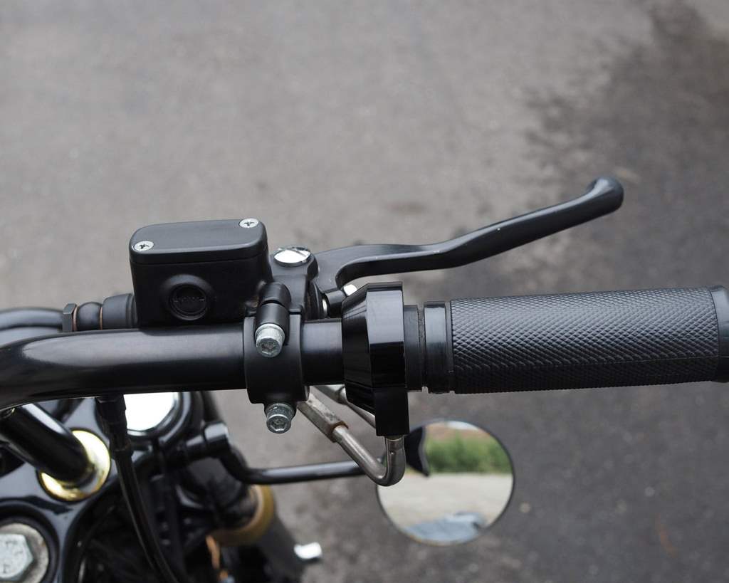 色:ブラックサイズ:ボア径:9/16インチ クランプ:1インチバンジョーボルトサイズ:7/16-24ハンドルクランプ部ボルトサイズ:1/4-20×1in適合車種:1インチハンドルを装着した、主にシングルキャリパー車素材:アルミ内容物:ブレーキコントロールAssy×1専用ミラーステム×1DOT4用シール×2注意事項:装着及び動作確認を行う前に、内部洗浄及びブレーキグリスの塗布を推奨致します。マスターのトップカバーは締め付け過ぎないようご注意下さい。ブレーキレバーのハンマーがピストンを押さえる構造になっており、車体に装着状態でブレーキレバーを外すとピストンが出てきてしまうことによって、フルードが漏れ出す恐れがございますのでご注意下さい。DOT4を使用する際には付属のシールに交換して下さい。※取付イメージ画像はブラックになります。純正ハウジングに準じたミラーステムは対応していません。付属のミラーステムをご利用下さい。商品説明:ハンドルまわりをすっきりとさせるカスタムに最適な、シンプルなデザインを追及したハンドコントロールです。オールドスクールチョッパーとの相性も抜群!シックなブラックフィニッシュで、綺麗なハンドル周りを演出します。シングルディスク車向けのマスターボアとなっております。ピボットと入れ替えてお使い頂ける専用のミラーステムも付属!