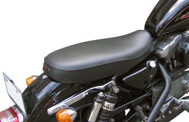 ※ご注文に際しては装着車両モデル・年式の確認が必要です。注文備考欄に入力をお願いします。適合車種:〜03年XLスポーツスター。●特徴について:ライダー、パッセンジャー側共に充分なシート幅がありますから、2人での走行にも適しています。シート前側のラインを狭くして足付きを良くしています。取付は加工無し、純正のボルトで装着できます。シート全体をプレーン黒レザーで仕上げています。縫い合わせラインには黒パイピングを挟み込んでいます。タンデムベルトは標準装備ですが、取り外し可能です。インジェクションスポンジを使用していますから、乗り心地は抜群、型くずれせず、長くご愛用いただけます。