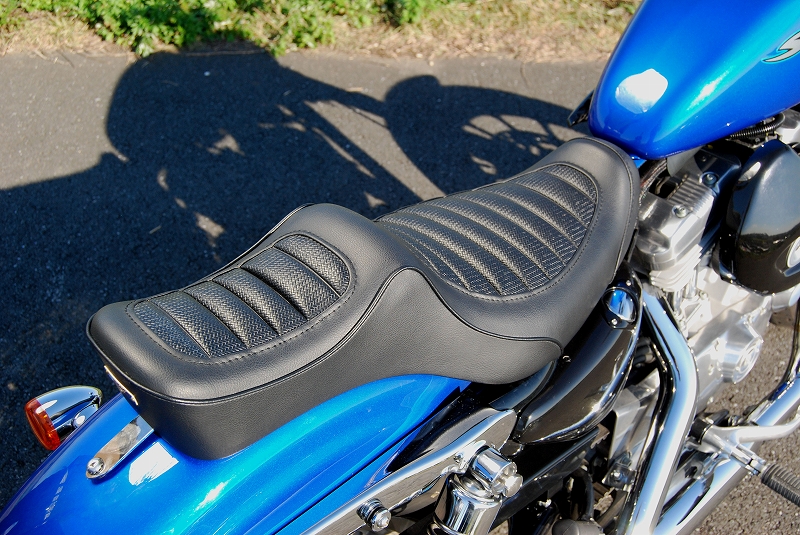 レザーはプレーン黒レザー、タックロールはメッシュレザーを使用。後部からの縫い合わせラインにはパイピングを挟んでいます。