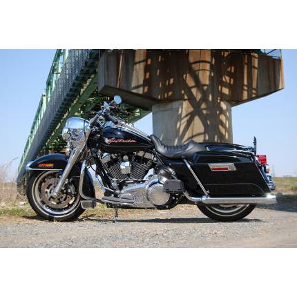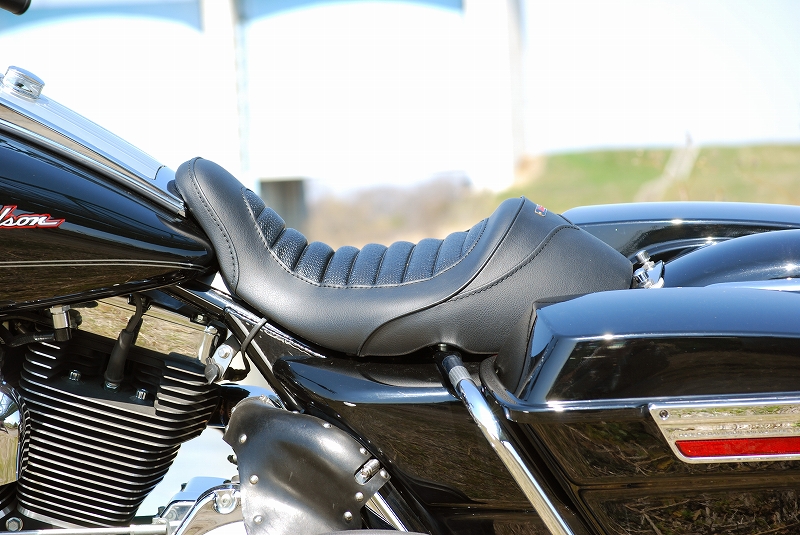 適合車種:17年以降FLHRXS15年以降FLHXS15年以降FLTRXS11〜19年FLTRU15〜19年FLHTKL10年以降FLHTK10〜19年FLTRX08〜19年FLTRX SE CVO08〜09年FLTR08年以降FLHR08〜15年FLHRC08〜19年FLHX08〜19年FLHX SE CVO08〜11年FLHTC08年以降FLHT08〜15年FLHTCU08〜19年FLHTCU CVO SE※ご注文に際しては装着車両モデル・年式の確認が必要です。注文備考欄に入力をお願いします。足付きと乗り心地の良さで好評をいただいているS-5119Tソロシートから、更にシート高が15mm低くなっています。高品質のインジェクションスポンジを使用していますから、適度なコシと柔らかさを保っています。型くずれせず、長くご愛用いただけます。ソロシート同様乗り心地が良くなるよう座面幅を広く取り、足を下ろす際に内股に当たる部分を極力細くテーパーにして足付きを良くしています。先端部が絞り込まれた鞍型のシートのような形状です。幅の広い純正シートに比べ膝裏に当たる違和感が無く、ガニ股ならずに足をまっすぐ下ろすことができ、車体を支える際に足先に力が入れやすくなります。足を下ろす動作に対して邪魔になる物が無くなる為、咄嗟の際にも瞬時に足を出すことができます。ノーマルシートで「ハンドルが遠い、ブレーキペダルが遠い、足付きに不安がある」という方にお勧めです。●特徴:プレーンの黒レザーを使用していますが、タックロール部分はメッシュレザーとなります。後部からのラインにはパイピングを挟み込み、タックロール周囲、後部デザインラインはステッチ仕上げです。