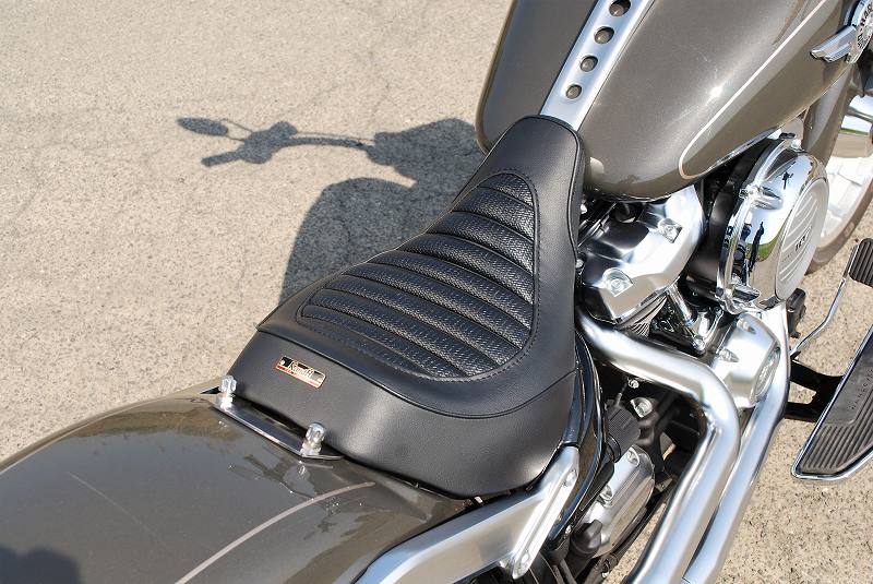 適合車種:18〜19年FLFB18年以降FLFBS※ご注文に際しては装着車両モデル・年式の確認が必要です。注文備考欄に入力をお願いします。・2018年からのFATBOY (FLFB/FLFBS) 専用ソロシート。*後部ストッパーは、リーチシート【S-6101】より後ろ目の設定です。・インジェクションスポンジを使用。乗り心地良く、型崩れせず、長くご愛用頂けます。・取り付けステーまでセットでお届け。純正シート同様フェンダー2点固定でボルトオン装着が可能。*ソロシート系のシートを装着の際取付けナット部分が露出してしまいますので、装飾のある【P-58】シートナットマウンティング(2個1set 4200円税抜)で固定することをお勧めします。またその際【P-50】ウレタンワッシャーを挟み込むことで、後部からの見栄えを良くします。上記2点はこの商品ページでシートと同時購入も可能です。●ご注意:純正リアシートとの併用は出来ません。弊社の専用リアシート【S-6109】をご検討下さい。●特徴:プレーンレザーを使用し、座面中央にはメッシュレザーのタックロールをはめ込んでいます。後部からの縫い合わせラインは黒パイピングを挟み込み、前切替、タックロール周囲はステッチ仕上げです。