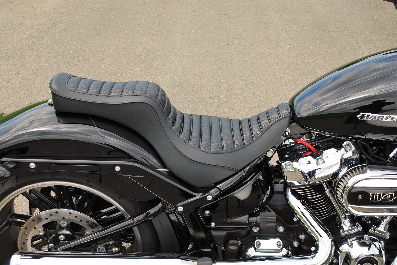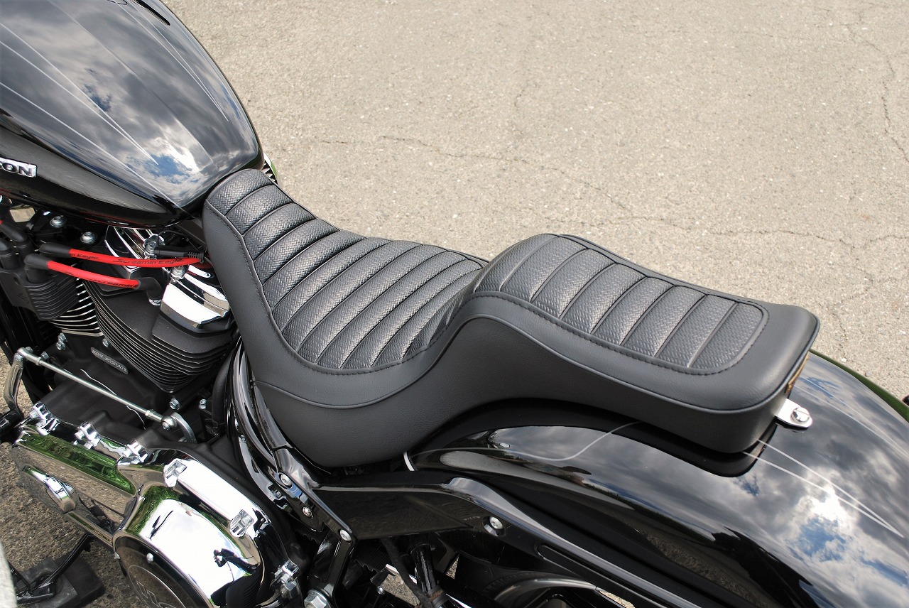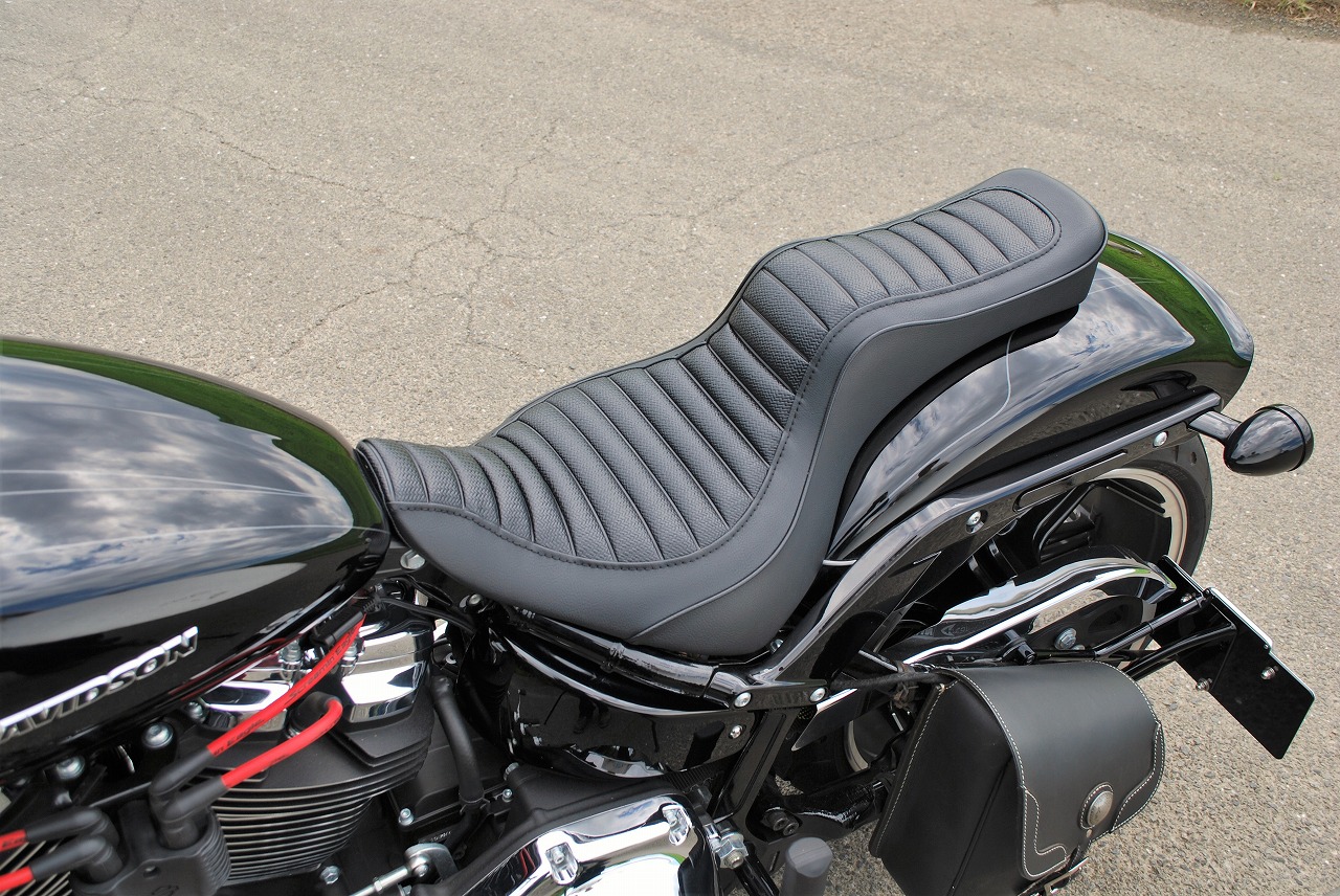 適合車種:18〜19年FXBR18年以降FXBRS※ご注文に際しては装着車両モデル・年式の確認が必要です。注文備考欄に入力をお願いします。・2018年からのBREAKOUT (FXBR/FXBRS) 専用K&Qタックロールです。着座位置が前目になるので、ハンドルが遠い、フォワードコントロールでステップが遠い、という方にお勧め。・インジェクションスポンジを使用。乗り心地良く、型崩れせず、長くご愛用頂けます。・取り付けステーまでセットでお届け。純正シート同様フェンダー1点固定でボルトオン装着が可能。●特徴:プレーンレザーを使用し、ライダーとパッセンジャー側それぞれの座面中央にはメッシュレザーのタックロールをはめ込んでいます。後部からの縫い合わせラインは黒パイピングを挟み込み、前切替、タックロール周囲はステッチ仕上げです。