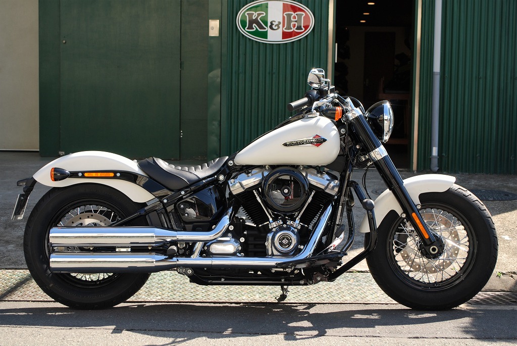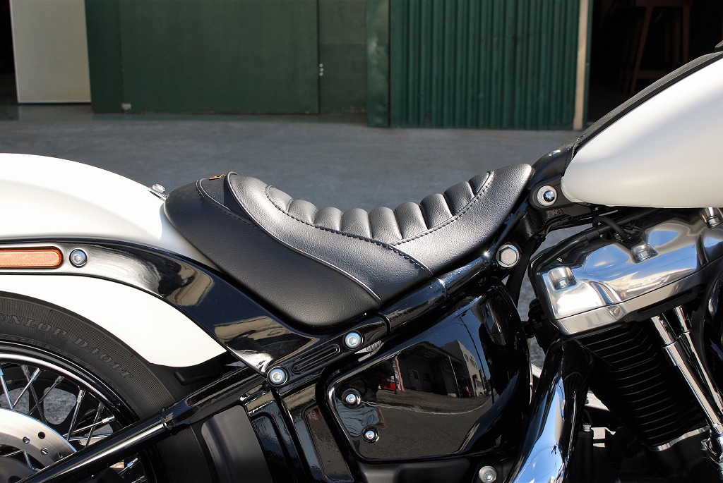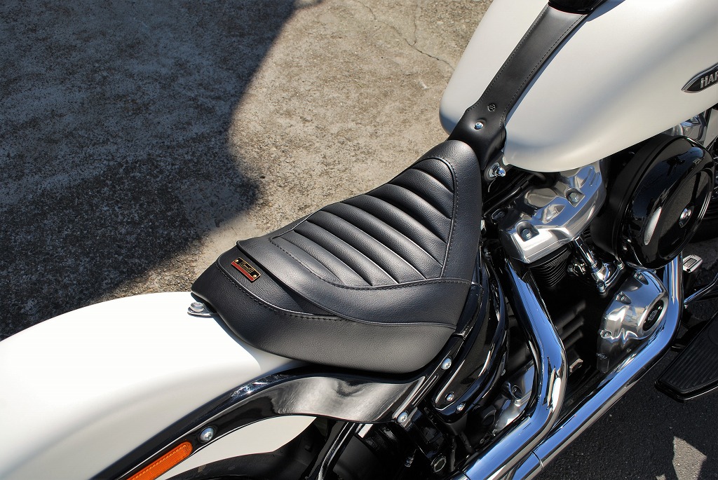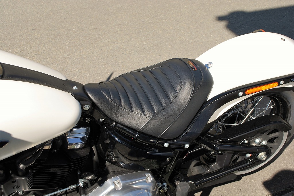 適合車種:18年以降FLSL18年以降FXBB※ご注文に際しては装着車両モデル・年式の確認が必要です。注文備考欄に入力をお願いします。2018年〜 STREET BOB / SOFTAIL SLIM ストリートボブ /ソフテイルスリム (FLSL FXBB)用のシート後部ストッパーが前目になっているリーチシート。ソフテイルデラックス・ヘリテイジクラシックにも装着可能です。シートポジションが決まらない、ハンドルが遠い、シフトチェンジがし難い、ブレーキペダルが遠い、そんな方にはこのリーチシートがお勧めです。ポジションが車体前後の中央辺り良い位置になり、サスペンションの伸び縮み、ステアリングの切れるタイミングが掴み易くなります。確りとしたシートベースに取り付け剛性、弾力に富んだスポンジの恩恵は、乗り心地の良さだけでは無く、フロント、リア共にタイヤからのインフォメーションが増幅し、ライディングプレジャーをより感じることが出来ます。シートベースの幅は、フレームぎりぎりまで細くしてあります。下ろした足が車体(フレームやサイドカバー)の一番細くなった所を通り、プライマリー(ダービー)カバーの膨らみより前方に足をつけます。最短の距離で足をつけるので、足先に力が入れ易く車体を支え易くなります。着座位置のスポンジの厚みと幅を十分に確保しているので、乗り心地良く足つきも良くなっています。小柄なライダーでもシフトチェンジがし易くなり、今までつま先で前に押し出していたブレーキペダルを上から踏み込むことが出来るようになります。シートベースとリアフェンダーとの間にETCが収まるスペースを確保してあります。●特徴:型の中で発泡させたインジェクションスポンジを使用しているので、乗り心地良く、型崩れせず、長くご愛用いただけけます。取り付けステー付属で、純正シート同様フェンダー1点固定でボルトオン装着が可能です。座面中央はプレーンブラックレザーの横タックロール仕上げ、その他はプレーンブラックレザー。後部シートストッパー頂点からサイドに落ちるラインはパイピング、その他デザインラインは全てステッチ仕上げです。