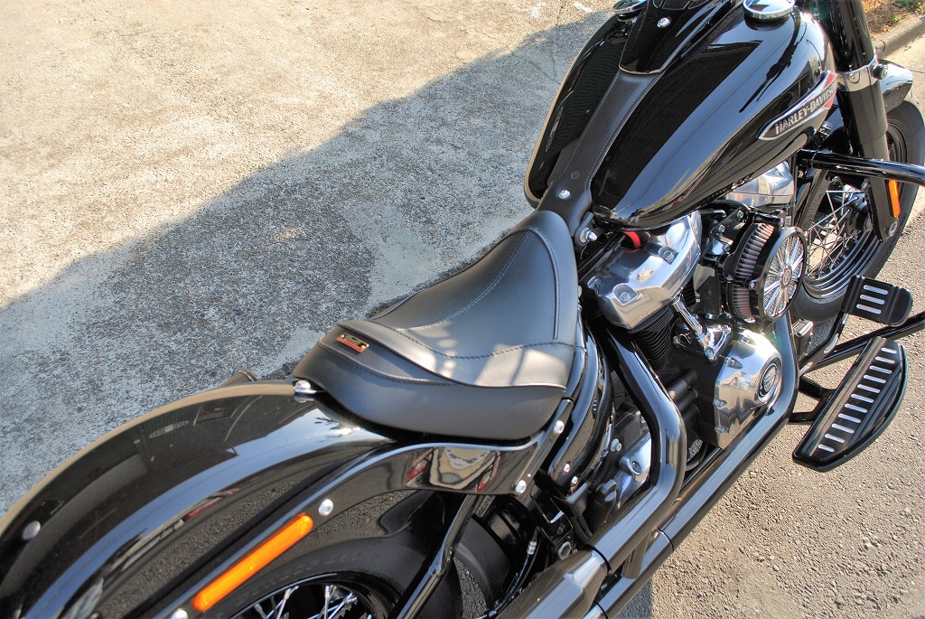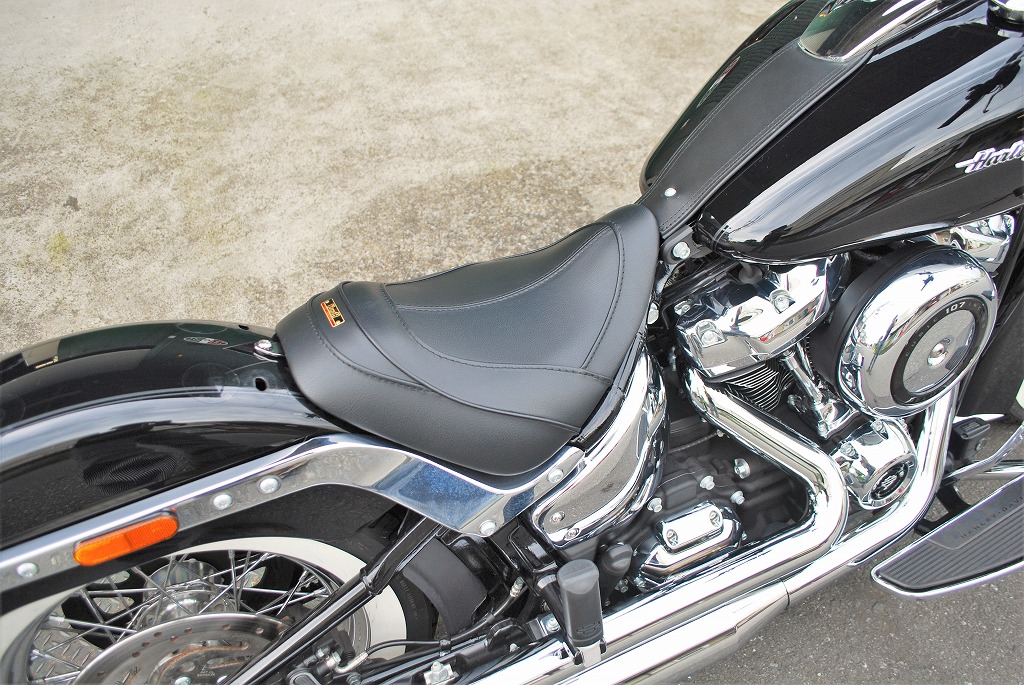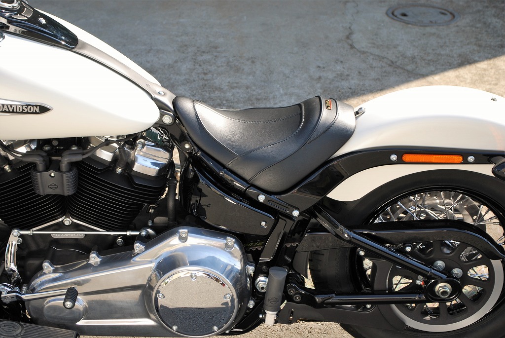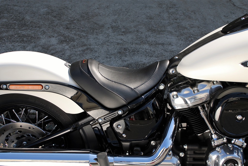 適合車種:18年以降FLSL18年以降FXBB※ご注文に際しては装着車両モデル・年式の確認が必要です。注文備考欄に入力をお願いします。2018年〜 STREET BOB / SOFTAIL SLIM ストリートボブ /ソフテイルスリム (FLSL FXBB)用のシート後部ストッパーが前目になっているリーチシート。ソフテイルデラックス・ヘリテイジクラシックにも装着可能です。シートポジションが決まらない、ハンドルが遠い、シフトチェンジがし難い、ブレーキペダルが遠い、そんな方にはこのリーチシートがお勧めです。ポジションが車体前後の中央辺り良い位置になり、サスペンションの伸び縮み、ステアリングの切れるタイミングが掴み易くなります。確りとしたシートベースに取り付け剛性、弾力に富んだスポンジの恩恵は、乗り心地の良さだけでは無く、フロント、リア共にタイヤからのインフォメーションが増幅し、ライディングプレジャーをより感じることが出来ます。シートベースの幅は、フレームぎりぎりまで細くしてあります。下ろした足が車体(フレームやサイドカバー)の一番細くなった所を通り、プライマリー(ダービー)カバーの膨らみより前方に足をつけます。最短の距離で足をつけるので、足先に力が入れ易く車体を支え易くなります。着座位置のスポンジの厚みと幅を十分に確保しているので、乗り心地良く足つきも良くなっています。小柄なライダーでもシフトチェンジがし易くなり、今までつま先で前に押し出していたブレーキペダルを上から踏み込むことが出来るようになります。シートベースとリアフェンダーとの間にETCが収まるスペースを確保してあります。●特徴:型の中で発泡させたインジェクションスポンジを使用しているので、乗り心地良く、型崩れせず、長くご愛用いただけけます。取り付けステー付属で、純正シート同様フェンダー1点固定でボルトオン装着が可能です。後部シートストッパー頂点からサイドに落ちるラインはパイピング、その他デザインラインは全てステッチ仕上げです。