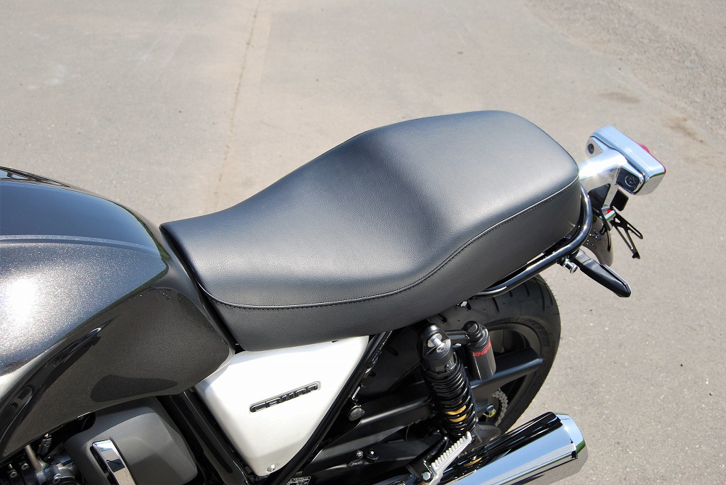 ※ご注文に際しては装着車両モデル・年式の確認が必要です。注文備考欄に入力をお願いします。適合車種:2017年〜 CB1100RS/CB1100EX フランジレスタンク2017年以降のCB1100RS/EX用シートです。純正シートに対しシート高+10mmとなります。座面の傾斜や幅、高さ、形状を見直して乗り心地の良いシートに仕上がっています。ライダー側・パッセンジャー側ともに充分なスポンジの厚みと幅を持たせ、座面の傾斜も見直し。タンデムツーリングをする方にもお勧め、ソロツーリングの際は荷物の積載もし易くなります。乗り心地が良くなるよう着座部分の幅はある程度確保し、足を下ろす部分は幅を細くしてありますので、足つきも良好です。型の中で発砲させたインジェクションスポンジを使用。クッション性が良く経年劣化が少ないため、長くご愛用頂けます。【ご注意】2016年以前の車両には装着できません。シート裏側に書類入れはありません。【シート高】CB1100RS:795mm (純正シート785mm)CB1100EX:790mm (純正シート780mm)【特徴】・座面にプレーンブラックレザーを使用。縫い合わせのラインが座面を一周するAタイプ。・タンデムベルトはボルト止めで標準装備。取付は純正シート同様キーロック方式で、純正キャリア・トップボックスとの併用も可。
