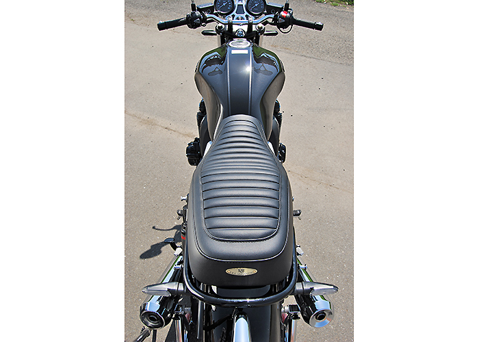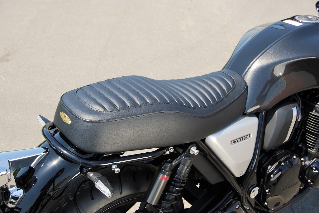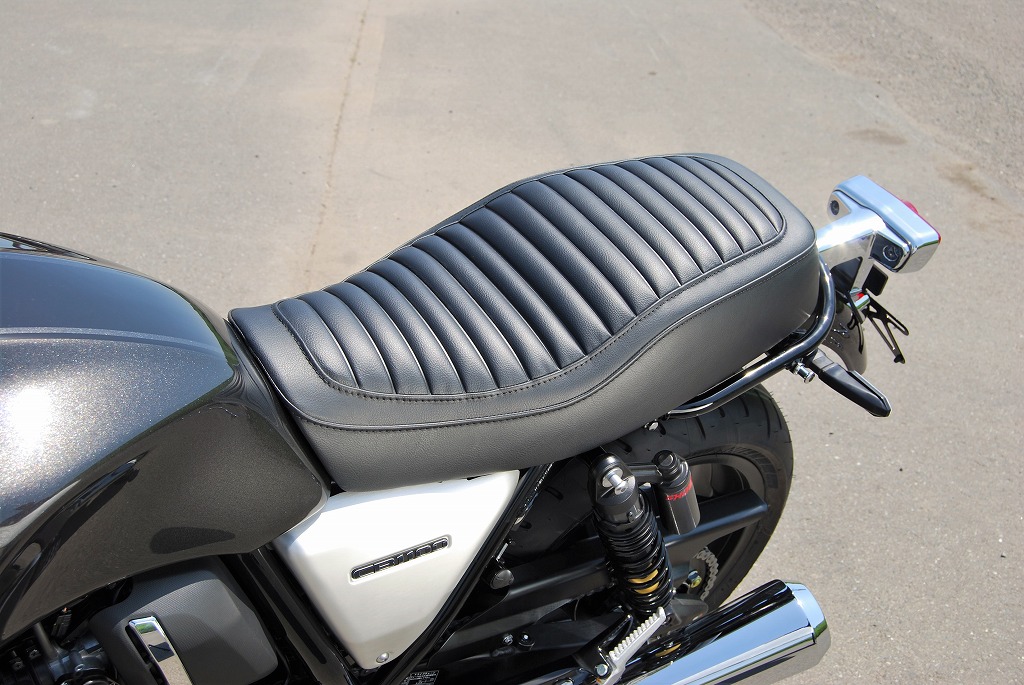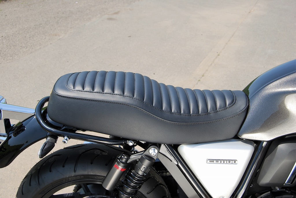 ※ご注文に際しては装着車両モデル・年式の確認が必要です。注文備考欄に入力をお願いします。適合車種:2017年〜 CB1100RS/CB1100EX フランジレスタンク2017年以降のCB1100RS/EX用シートです。純正シートに対しシート高+10mmとなります。座面の傾斜や幅、高さ、形状を見直して乗り心地の良いシートに仕上がっています。ライダー側・パッセンジャー側ともに充分なスポンジの厚みと幅を持たせ、座面の傾斜も見直し。タンデムツーリングをする方にもお勧め、ソロツーリングの際は荷物の積載もし易くなります。乗り心地が良くなるよう着座部分の幅はある程度確保し、足を下ろす部分は幅を細くしてありますので、足つきも良好です。型の中で発砲させたインジェクションスポンジを使用。クッション性が良く経年劣化が少ないため、長くご愛用頂けます。【ご注意】2016年以前の車両には装着できません。シート裏側に書類入れはありません。【シート高】CB1100RS:795mm (純正シート785mm)CB1100EX:790mm (純正シート780mm)【特徴】・座面にプレーンブラックレザーのタックロールを使用。縫い合わせのラインはステッチ仕上げ、ラインが座面周囲を囲むAタイプ。・タンデムベルトはボルト止めで標準装備。取付は純正シート同様キーロック方式で、純正キャリア・トップボックスとの併用も可。