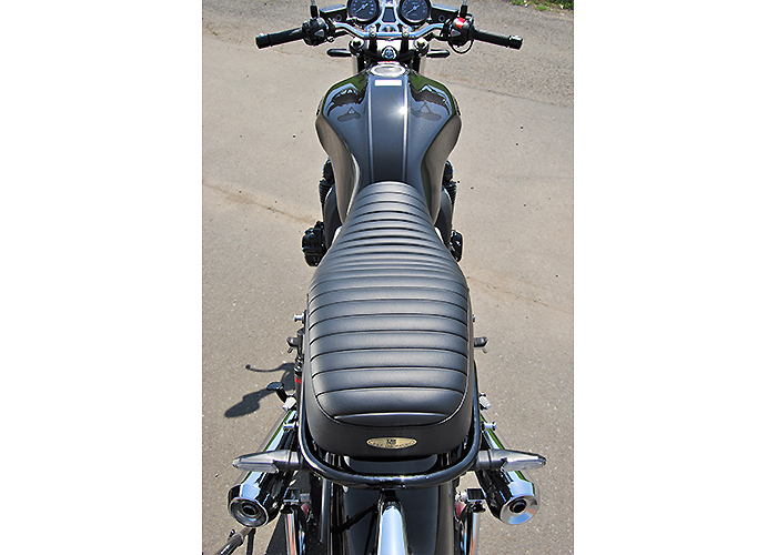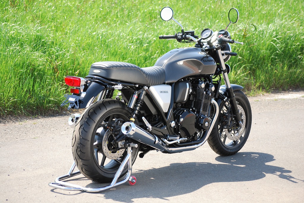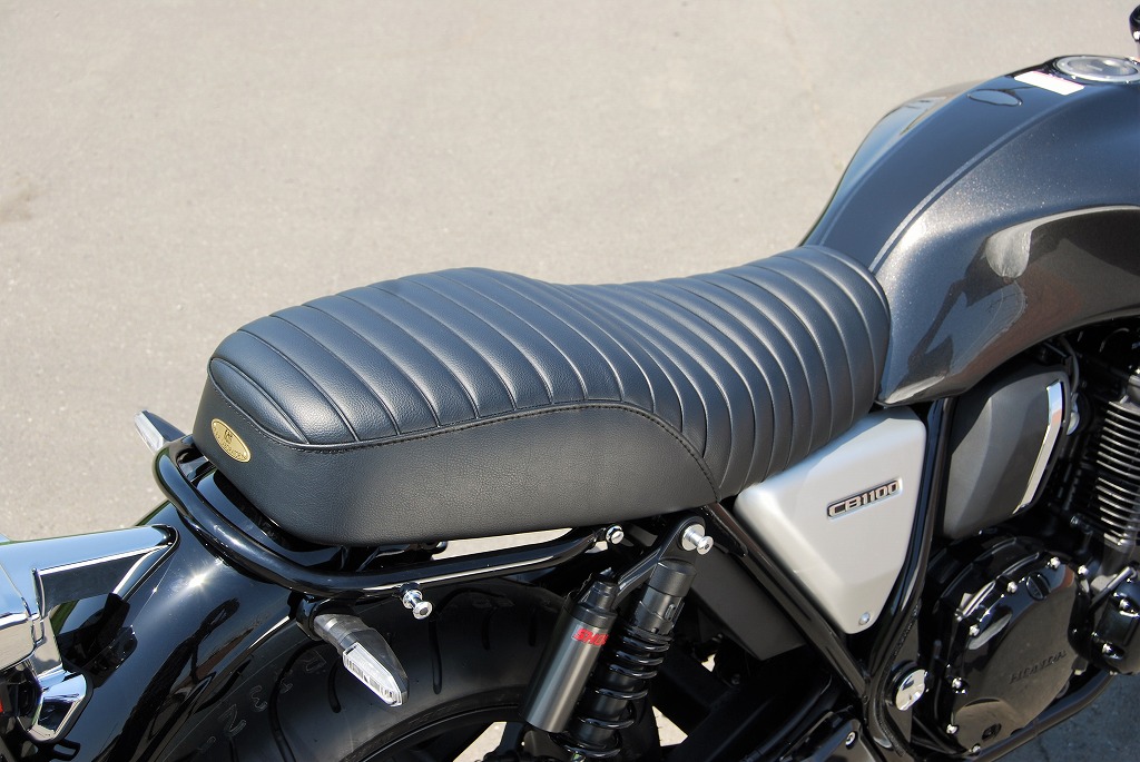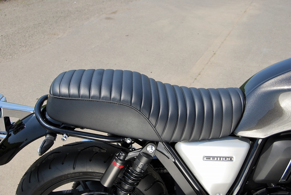 ※ご注文に際しては装着車両モデル・年式の確認が必要です。注文備考欄に入力をお願いします。適合車種:2017年〜 CB1100RS/CB1100EX フランジレスタンク2017年以降のCB1100RS/EX用シートです。純正シートに対しシート高+10mmとなります。座面の傾斜や幅、高さ、形状を見直して乗り心地の良いシートに仕上がっています。ライダー側・パッセンジャー側ともに充分なスポンジの厚みと幅を持たせ、座面の傾斜も見直し。タンデムツーリングをする方にもお勧め、ソロツーリングの際は荷物の積載もし易くなります。乗り心地が良くなるよう着座部分の幅はある程度確保し、足を下ろす部分は幅を細くしてありますので、足つきも良好です。型の中で発砲させたインジェクションスポンジを使用。クッション性が良く経年劣化が少ないため、長くご愛用頂けます。【ご注意】2016年以前の車両には装着できません。シート裏側に書類入れはありません。【シート高】CB1100RS:795mm (純正シート785mm)CB1100EX:790mm (純正シート780mm)【特徴】・座面にプレーンブラックレザーのタックロールを使用。縫い合わせのラインはステッチ仕上げ、ラインが途中で下に落ちるBタイプ。・タンデムベルトはボルト止めで標準装備。取付は純正シート同様キーロック方式で、純正キャリア・トップボックスとの併用も可。