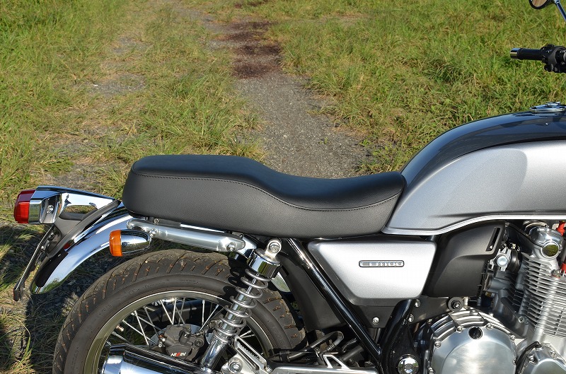 ※ご注文に際しては装着車両モデル・年式の確認が必要です。注文備考欄に入力をお願いします。適合車種:〜2016年 CB1100EX 17Lタンク・純正シートに対し座面の傾斜や幅、高さ、形状を見直したCB1100 17Lタンク専用シートです。ライダー側・パッセンジャー側ともに充分なスポンジの厚みと幅を持たせ、座面の傾斜も見直し。タンデムツーリングをする方にもお勧め、ソロツーリングの際は荷物の積載もし易くなります。・乗り心地が良くなるよう着座部分の幅はある程度確保し、足を下ろす部分は幅を細くしてありますので、足つきも良好です。・型の中で発砲させたインジェクションスポンジを使用。クッション性が良く経年劣化が少ないため、長くご愛用頂けます。【ご注意】2018年までのCB1100については、『CB1100 14Lタンク』のカテゴリーからお選び下さい。シート裏側に書類入れはありません。【特徴】シート高:797mm(EX純正シート高785mm)・全体にプレーンブラックレザーを使用。縫い合わせのラインはステッチ仕上げ、ラインが座面周囲を囲むAタイプ。・タンデムベルトはボルト止めで標準装備。・取付は純正シート同様キーロック方式。・純正キャリア・トップボックスとの併用も可。