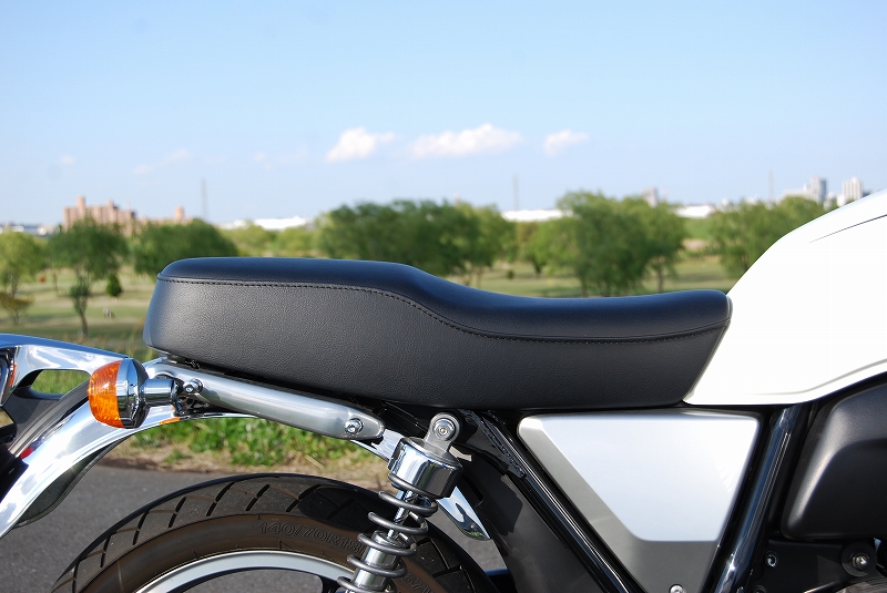 ※ご注文に際しては装着車両モデル・年式の確認が必要です。注文備考欄に入力をお願いします。適合車種:2010〜2018年 CB1100 14Lタンク・純正シートに比べシート高が48mmほど高くなっていますので、純正シートで膝や足元が窮屈に感じる方にお勧めです。ライダー側・パッセンジャー側ともに充分なスポンジの厚みと幅を持たせ、座面の傾斜も見直し。タンデムツーリングをする方にもお勧め、ソロツーリングの際は荷物の積載もし易くなります。・乗り心地が良くなるよう着座部分の幅はある程度確保し、足を下ろす部分は幅を細くしてありますので、足つきも良好です。・型の中で発砲させたインジェクションスポンジを使用。クッション性が良く経年劣化が少ないため、長くご愛用頂けます。【ご注意】CB1100EXには装着できません。シート裏側に書類入れはありません。【特徴】シート高:813cm・座面中央にプレーンブラックのタックロールを使用。縫い合わせのラインはステッチ仕上げ、ラインが座面周囲を囲むAタイプ。・タンデムベルトはボルト止めで標準装備。・取付は純正シート同様キーロック方式。・純正キャリア・トップボックスとの併用も可。