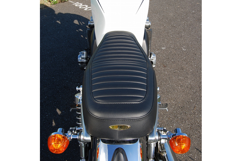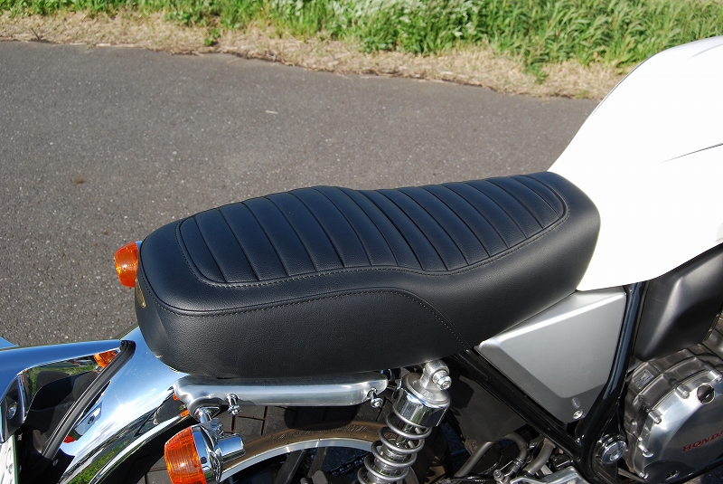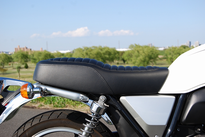 ※ご注文に際しては装着車両モデル・年式の確認が必要です。注文備考欄に入力をお願いします。適合車種:2010〜2018年 CB1100 14Lタンク・純正シートに比べシート高が48mmほど高くなっていますので、純正シートで膝や足元が窮屈に感じる方にお勧めです。ライダー側・パッセンジャー側ともに充分なスポンジの厚みと幅を持たせ、座面の傾斜も見直し。タンデムツーリングをする方にもお勧め、ソロツーリングの際は荷物の積載もし易くなります。・乗り心地が良くなるよう着座部分の幅はある程度確保し、足を下ろす部分は幅を細くしてありますので、足つきも良好です。・型の中で発砲させたインジェクションスポンジを使用。クッション性が良く経年劣化が少ないため、長くご愛用頂けます。【ご注意】CB1100EXには装着できません。シート裏側に書類入れはありません。【特徴】シート高:813cm・座面中央にプレーンブラックのタックロールを使用。縫い合わせのラインはステッチ仕上げ、ラインが途中で下に落ちるBタイプ。・タンデムベルトはボルト止めで標準装備。・取付は純正シート同様キーロック方式。・純正キャリア・トップボックスとの併用も可。